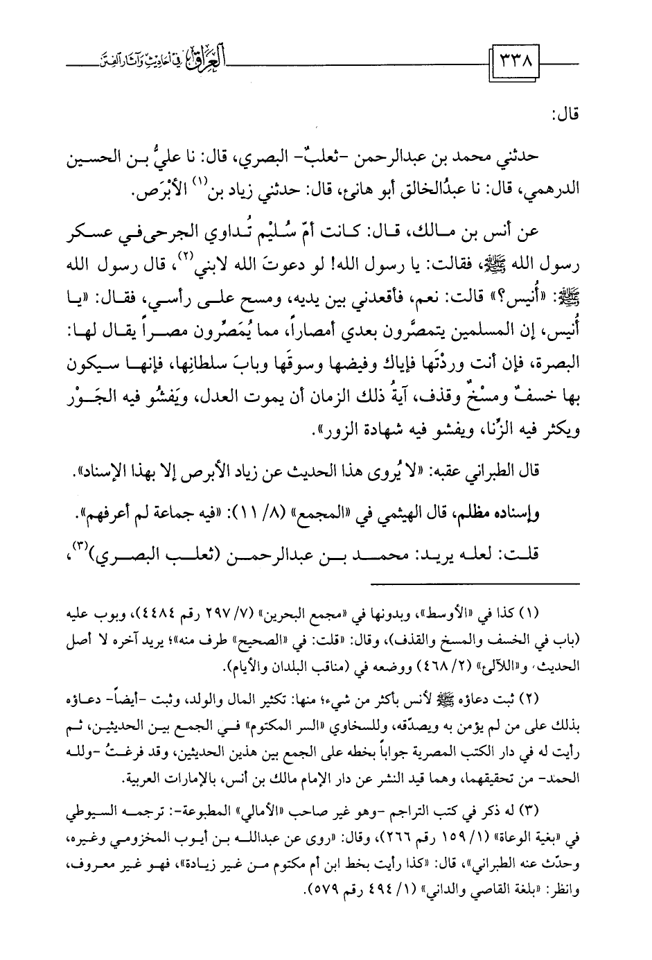 عن أنس بن مالك، قال: كانت أمّ سُليْم تُداوي الجرحىفي عسكر رسول الله صلى الله عليه وسلم، فقالت: يا رسول الله! لو دعوتَ الله لابني (¬2) ، قال رسول الله صلى الله عليه وسلم: «أُنيس؟» قالت: نعم، فأقعدني بين يديه، ومسح على رأسي، فقال: «يا أُنيس، إن المسلمين يتمصَّرون بعدي أمصاراً، مما يُمَصِّرون مصراً يقال لها: البصرة، فإن أنت وردْتَها فإياك وفيضها وسوقَها وبابَ سلطانِها، فإنها سيكون بها خسفٌ ومسْخٌ وقذف، آيةُ ذلك الزمان أن يموت العدل، ويَفشُو فيه الجَوْر ويكثر فيه الزِّنا، ويفشو فيه شهادة الزور» .