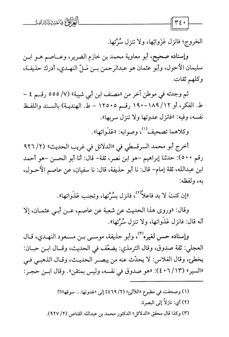 ثم وجدته في موطن آخر من «مصنف ابن أبي شيبة» (7/555 رقم 4 - ط. الفكر، أو 12/189-190 رقم 12505 - ط. الهندية) بالسند واللفظ نفسه، وفيه: «فانزل عدوتها ولا تنزل سربها» .