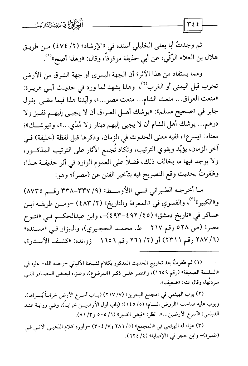 ومما يستفاد من هذا الأثر؛ أن الجهة اليسرى أو جهة الشرق من الأرض تخرب قبل اليمنى أو الغرب (¬2) ، وهذا يشهد لما ورد في حديث أبي هريرة: «منعت العراق ... منعت الشام ... منعت مصر ... » ، وأيّدنا هذا فيما مضى بقول جابر في «صحيح مسلم» : «يوشك أهل العراق أن لا يجبى إليهم قفيز ولا درهم ... يوشك أهل الشام أن لا يجبى إليهم دينار ولا مُدْي ... » ، و «يوشك» ؛ معناه: «يسرع» ، ففيه معنى الحدوث في الزمان، وذكرها قبل لفظة (خليفة) في آخر الزمان، يؤيّد ويقوي الترتيب، وتكاد تُجمع الآثار على الترتيب المذكور، ولا يوجد فيها ما يخالف ذلك، فضلاً على العموم الوارد في أثر حذيفة هذا، وظفرتُ بحديث وقع التصريح فيه بتأخير الفتن عن (مصر) ؛ وهو: