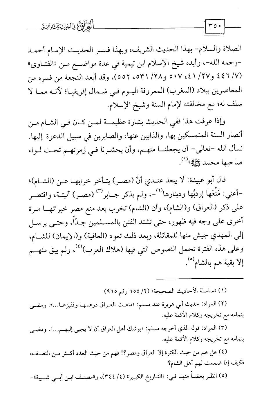 الصلاة والسلام- بهذا الحديث الشريف، وبهذا فسر الحديث الإمام أحمد -رحمه الله-، وأيده شيخ الإسلام ابن تيمية في عدة مواضع من «الفتاوى» (7/446 و27/41، 507 و28/531، 552) ، وقد أبعد النجعة من فسره من المعاصرين ببلاد (المغرب) المعروفة اليوم في شمال إفريقيا؛ لأنه مما لا سلف له؛ مع مخالفته لإمام السنة وشيخ الإسلام.