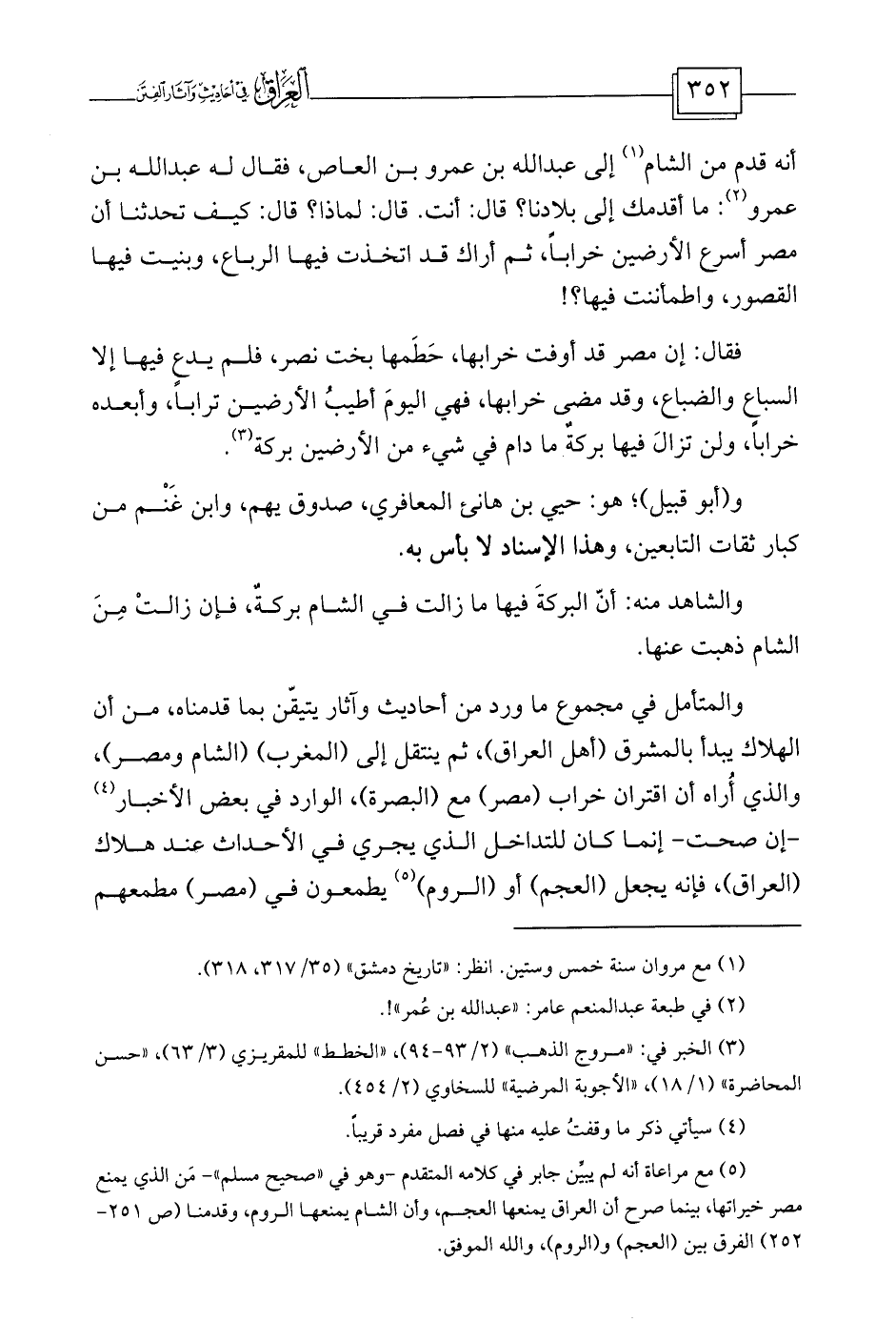 أنه قدم من الشام (¬1) إلى عبد الله بن عمرو بن العاص، فقال له عبد الله بن عمرو (¬2) : ما أقدمك إلى بلادنا؟ قال: أنت. قال: لماذا؟ قال: كيف تحدثنا أن مصر أسرع الأرضين خراباً، ثم أراك قد اتخذت فيها الرباع، وبنيت فيها القصور، واطمأننت فيها؟!