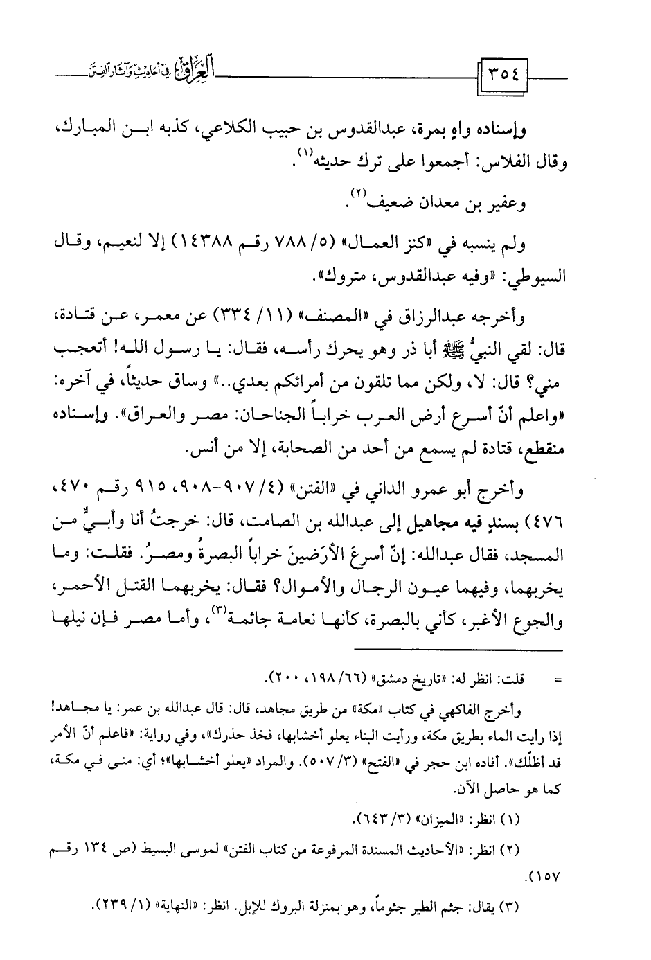 (¬2) انظر: «الأحاديث المسندة المرفوعة من كتاب الفتن» لموسى البسيط (ص 134 رقم 157) .