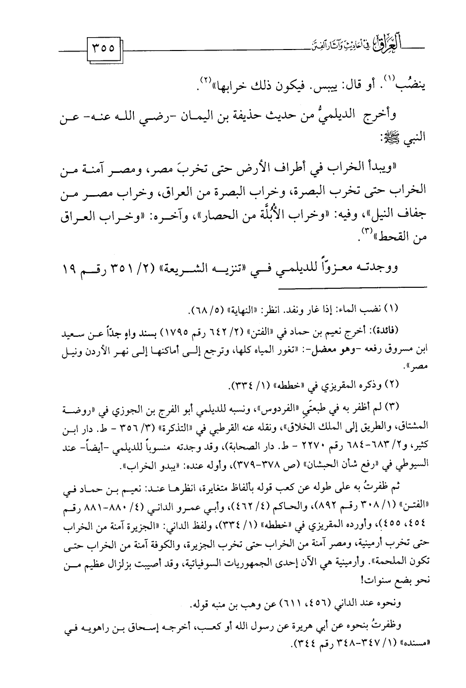 (¬3) لم أظفر به في طبعتَيِ «الفردوس» ، ونسبه للديلمي أبو الفرج بن الجوزي في «روضة المشتاق، والطريق إلى الملك الخلاق» ، ونقله عنه القرطبي في «التذكرة» (3/356 - ط. دار ابن كثير، و2/683-684 رقم 2270 - ط. دار الصحابة) ، وقد وجدته منسوباً للديلمي -أيضاً- عند السيوطي في «رفع شأن الحبشان» (ص 378-379) ، وأوله عنده: «يبدو الخراب» .