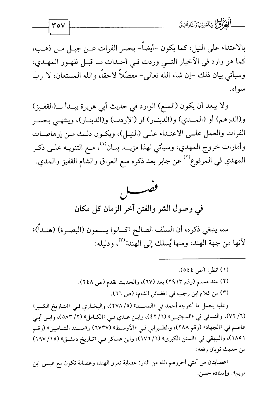 ولا يبعد أن يكون (المنع) الوارد في حديث أبي هريرة يبدأ بـ (القفيز) و (الدرهم) أو (المدي) و (الدينار) أو (الإردب) و (الدينار) ، وينتهي بحسر الفرات والعمل على الاعتداء على (النيل) ، ويكون ذلك من إرهاصات وأمارات خروج المهدي، وسيأتي لهذا مزيد بيان (¬1) ، مع التنويه على ذكر المهدي في المرفوع (¬2) عن جابر بعد ذكره منع العراق والشام القفيز والمدي.