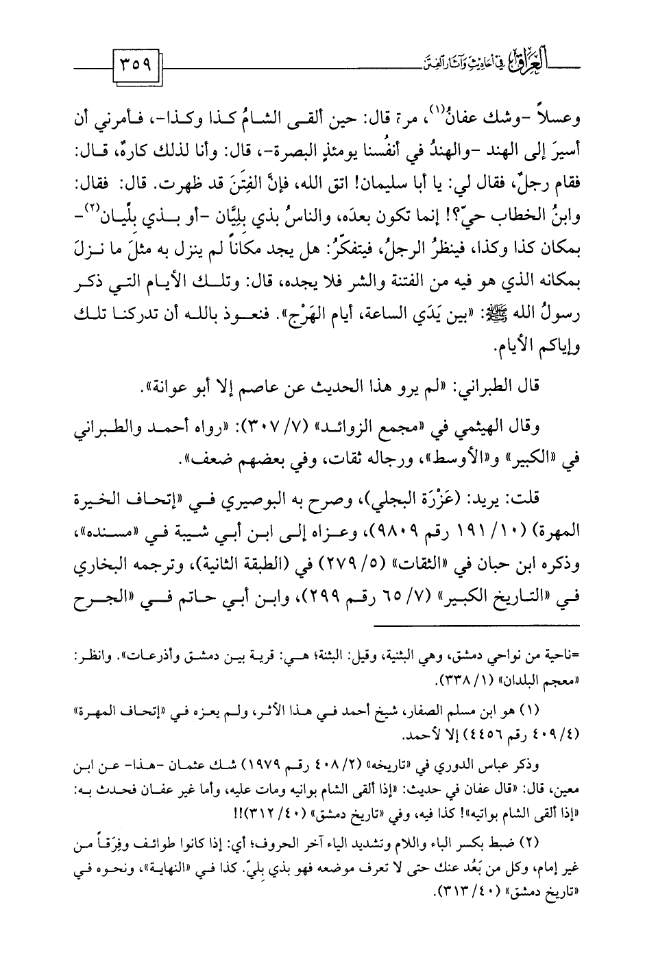 وذكر عباس الدوري في «تاريخه» (2/408 رقم 1979) شك عثمان -هذا- عن ابن معين، قال: «قال عفان في حديث: «إذا ألقى الشام بوانيه ومات عليه، وأما غير عفان فحدث به: «إذا ألقى الشام بواتيه» ! كذا فيه، وفي «تاريخ دمشق» (40/312) !!