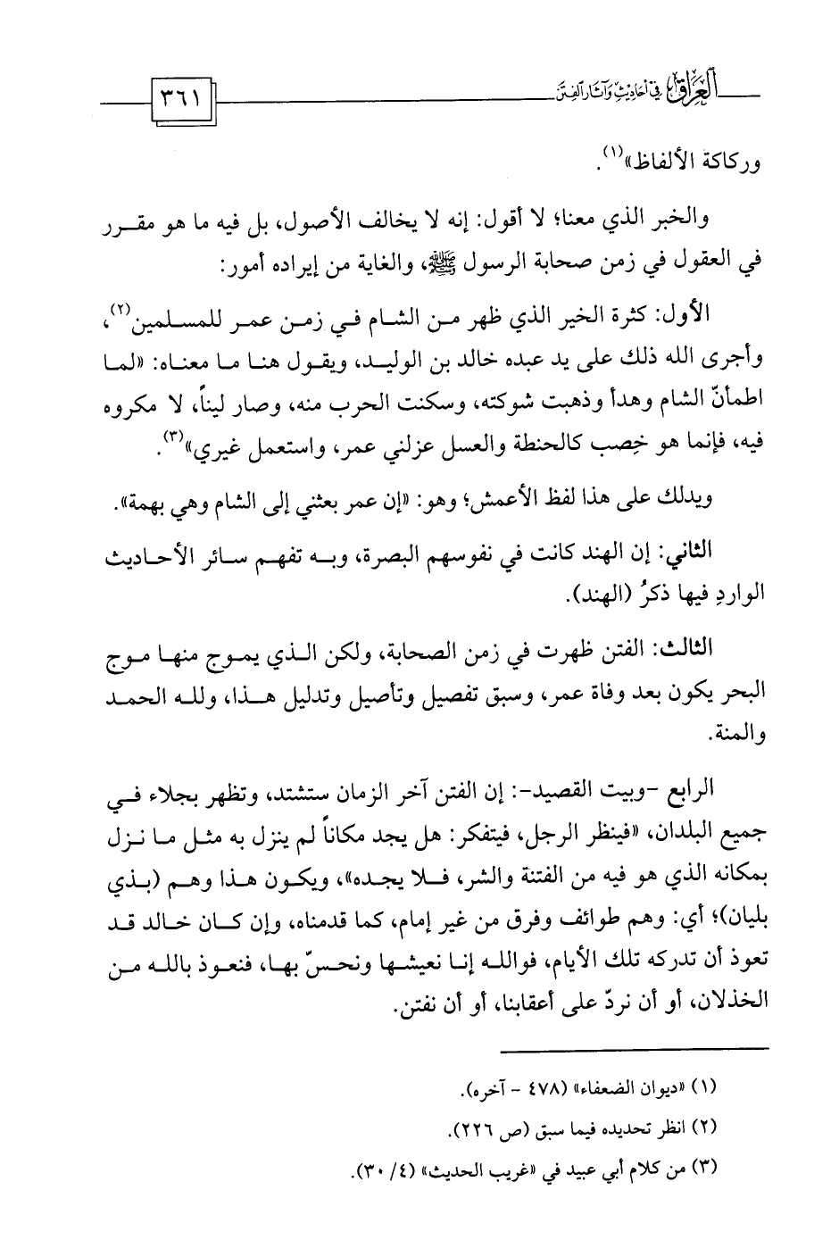 الرابع -وبيت القصيد-: إن الفتن آخر الزمان ستشتد، وتظهر بجلاء في جميع البلدان، «فينظر الرجل، فيتفكر: هل يجد مكاناً لم ينزل به مثل ما نزل بمكانه الذي هو فيه من الفتنة والشر، فلا يجده» ، ويكون هذا وهم (بذي بليان) ؛ أي: وهم طوائف وفرق من غير إمام، كما قدمناه، وإن كان خالد قد تعوذ أن تدركه تلك الأيام، فوالله إنا نعيشها ونحسّ بها، فنعوذ بالله من الخذلان، أو أن نردّ على أعقابنا، أو أن نفتن.
