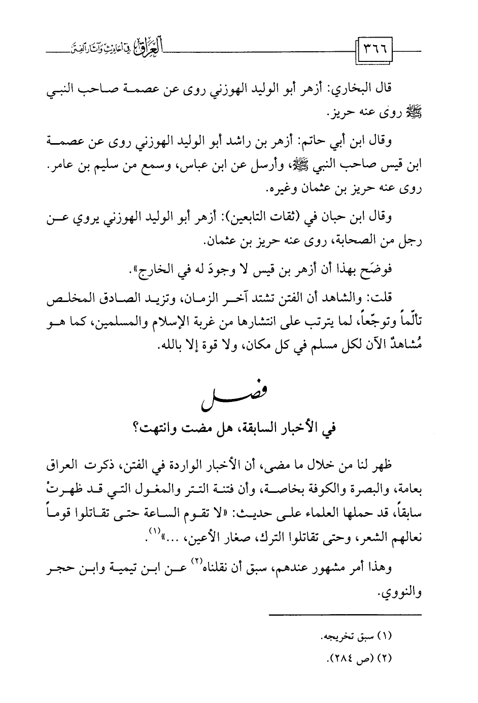 ظهر لنا من خلال ما مضى، أن الأخبار الواردة في الفتن، ذكرت العراق بعامة، والبصرة والكوفة بخاصة، وأن فتنة التتر والمغول التي قد ظهرتْ سابقاً، قد حملها العلماء على حديث: «لا تقوم الساعة حتى تقاتلوا قوماً نعالهم الشعر، وحتى تقاتلوا الترك، صغار الأعين، ... » (¬1) .
