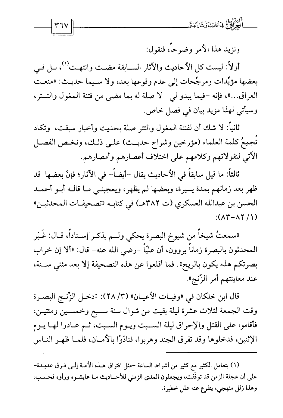 أولاً: ليست كل الأحاديث والآثار السابقة مضت وانتهت (¬1) ، بل في بعضها مؤيِّدات ومرجِّحات إلى عدم وقوعها بعد، ولا سيما حديث: «منعت العراق ... » ، فإنه -فيما يبدو لي- لا صلة له بما مضى من فتنة المغول والتتر، وسيأتي لهذا مزيد بيان في فصل خاص.
