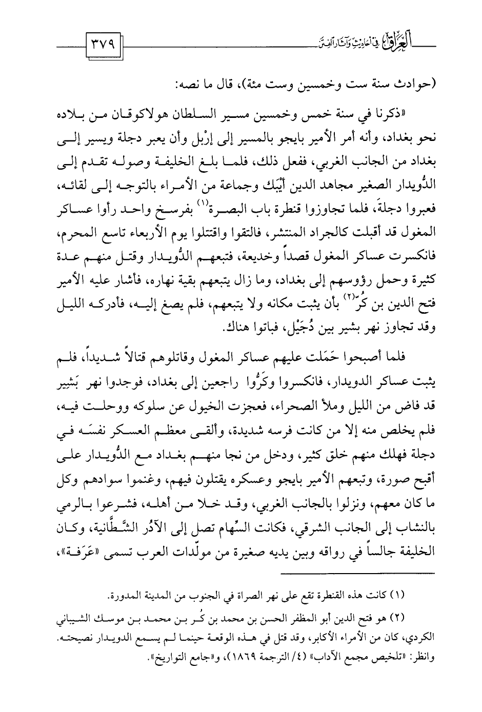 «ذكرنا في سنة خمس وخمسين مسير السلطان هولاكوقان من بلاده نحو بغداد، وأنه أمر الأمير بايجو بالمسير إلى إرْبل وأن يعبر دجلة ويسير إلى بغداد من الجانب الغربي، ففعل ذلك، فلما بلغ الخليفة وصوله تقدم إلى الدُّويدار الصغير مجاهد الدين أيْبَك وجماعة من الأمراء بالتوجه إلى لقائه، فعبروا دجلةَ، فلما تجاوزوا قنطرة باب البصرة (¬1) بفرسخ واحد رأوا عساكر المغول قد أقبلت كالجراد المنتشر، فالتقوا واقتتلوا يوم الأربعاء تاسع المحرم، فانكسرت عساكر المغول قصداً وخديعة، فتبعهم الدُّويدار وقتل منهم عدة كثيرة وحمل رؤوسهم إلى بغداد، وما زال يتبعهم بقية نهاره، فأشار عليه الأمير فتح الدين بن كُرّ (¬2) بأن يثبت مكانه ولا يتبعهم، فلم يصغ إليه، فأدركه الليل وقد تجاوز نهر بشير بين دُجَيْل، فباتوا هناك.