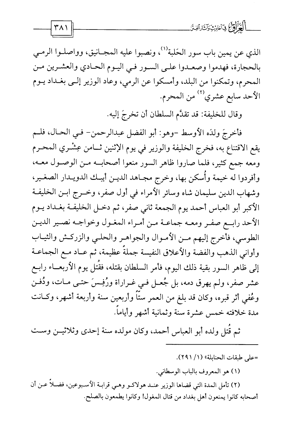 (¬2) تأمل المدة التي قضاها الوزير عند هولاكو وهي قرابة الأسبوعين، فضلاً عن أن أصحابه كانوا يمنعون أهل بغداد من قتال المغول! وكانوا يطمعون بالصلح.