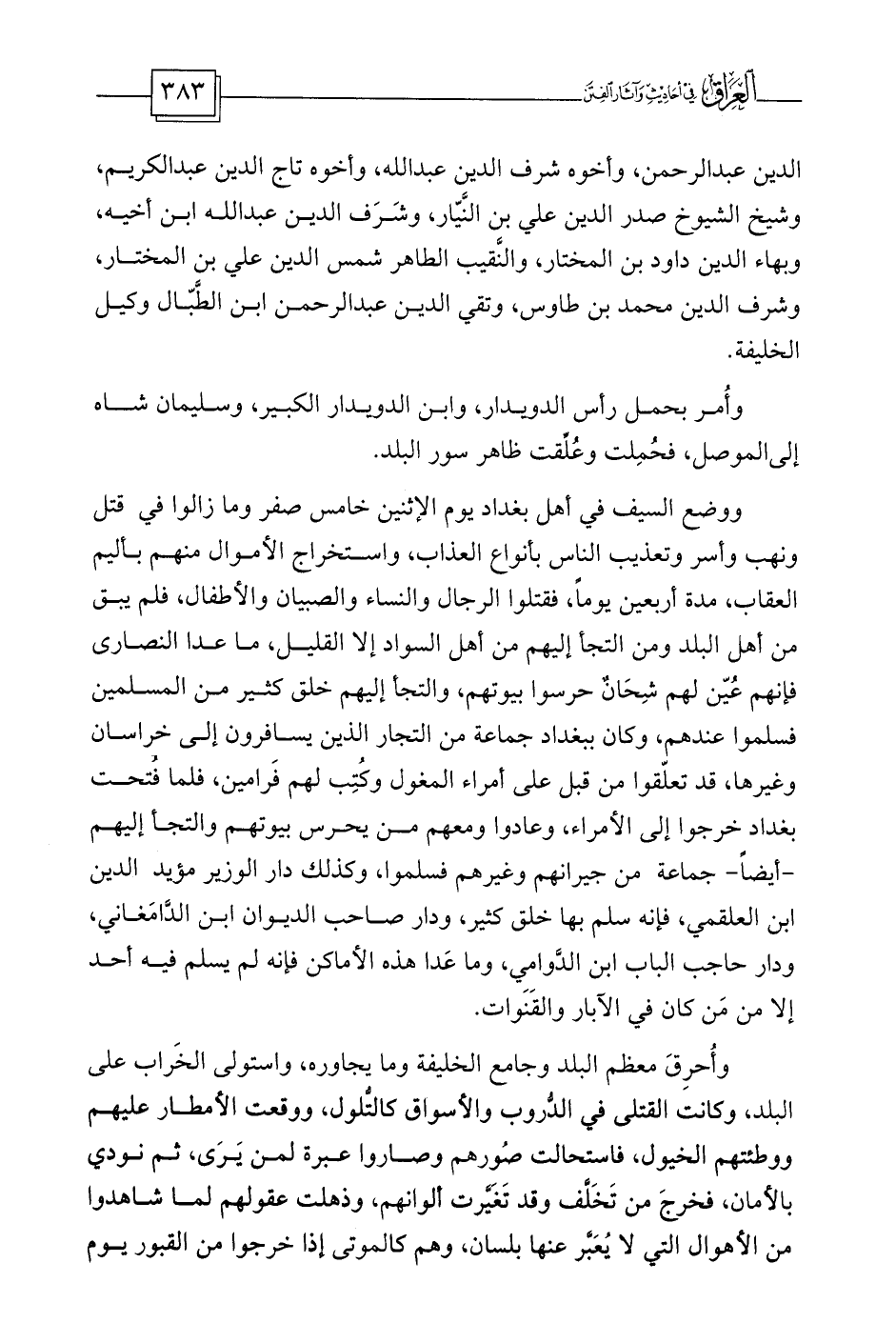 ووضع السيف في أهل بغداد يوم الإثنين خامس صفر وما زالوا في قتل ونهب وأسر وتعذيب الناس بأنواع العذاب، واستخراج الأموال منهم بأليم العقاب، مدة أربعين يوماً، فقتلوا الرجال والنساء والصبيان والأطفال، فلم يبق من أهل البلد ومن التجأ إليهم من أهل السواد إلا القليل، ما عدا النصارى فإنهم عُيّن لهم شِحَانٌ حرسوا بيوتهم، والتجأ إليهم خلق كثير من المسلمين فسلموا عندهم، وكان ببغداد جماعة من التجار الذين يسافرون إلى خراسان وغيرها، قد تعلّقوا من قبل على أمراء المغول وكُتِب لهم فَرامين، فلما فُتحت بغداد خرجوا إلى الأمراء، وعادوا ومعهم من يحرس بيوتهم والتجأ إليهم ... -أيضاً- جماعة من جيرانهم وغيرهم فسلموا، وكذلك دار الوزير مؤيد الدين ابن العلقمي، فإنه سلم بها خلق كثير، ودار صاحب الديوان ابن الدَّامَغاني، ودار حاجب الباب ابن الدَّوامي، وما عَدا هذه الأماكن فإنه لم يسلم فيه أحد إلا من مَن كان في الآبار والقَنَوات.
