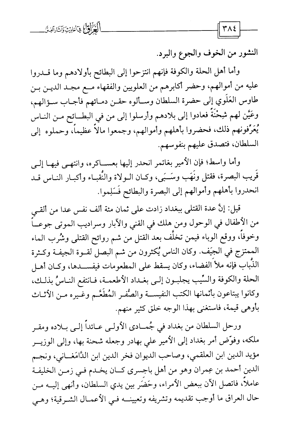 وأما أهل الحلة والكوفة فإنهم انتزحوا إلى البطائح بأولادهم وما قدروا عليه من أموالهم، وحضر أكابرهم من العلويين والفقهاء مع مجد الدين بن طاوس العَلَوي إلى حضرة السلطان وسألوه حقن دمائهم فأجاب سؤالهم، وعَيَّن لهم شِحْنَةً فعادوا إلى بلادهم وأرسلوا إلى من في البطائح من الناس يُعَرِّفونهم ذلك، فحضروا بأهلهم وأموالهم، وجمعوا مالاً عظيماً، وحملوه إلى السلطان، فتصدق عليهم بنفوسهم.