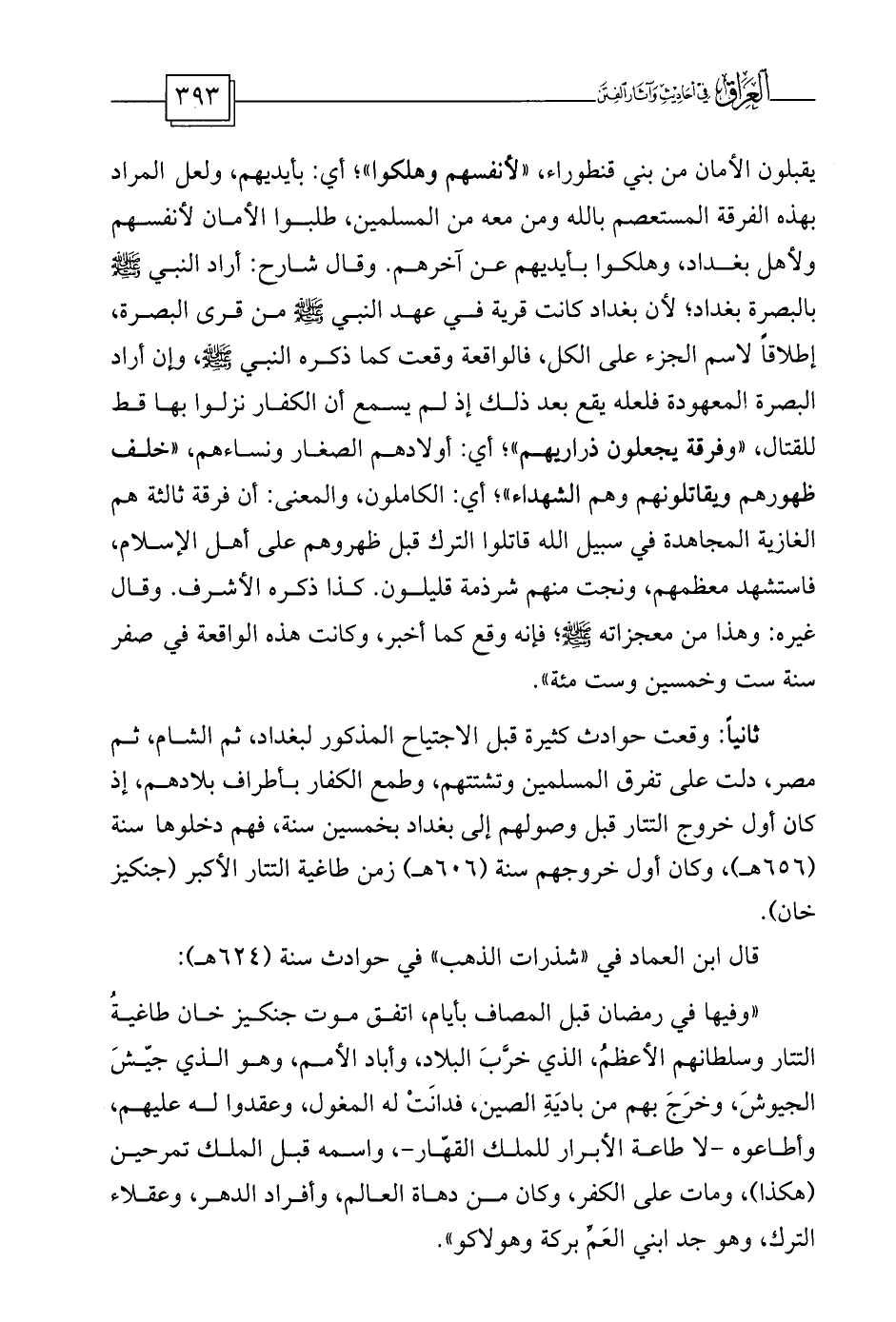 يقبلون الأمان من بني قنطوراء، «لأنفسهم وهلكوا» ؛ أي: بأيديهم، ولعل المراد بهذه الفرقة المستعصم بالله ومن معه من المسلمين، طلبوا الأمان لأنفسهم ولأهل بغداد، وهلكوا بأيديهم عن آخرهم. وقال شارح: أراد النبي صلى الله عليه وسلم بالبصرة بغداد؛ لأن بغداد كانت قرية في عهد النبي صلى الله عليه وسلم من قرى البصرة، إطلاقاً لاسم الجزء على الكل، فالواقعة وقعت كما ذكره النبي صلى الله عليه وسلم، وإن أراد البصرة المعهودة فلعله يقع بعد ذلك إذ لم يسمع أن الكفار نزلوا بها قط للقتال، «وفرقة يجعلون ذراريهم» ؛ أي: أولادهم الصغار ونساءهم، «خلف ظهورهم ويقاتلونهم وهم الشهداء» ؛ أي: الكاملون، والمعنى: أن فرقة ثالثة هم الغازية المجاهدة في سبيل الله قاتلوا الترك قبل ظهروهم على أهل الإسلام، فاستشهد معظمهم، ونجت منهم شرذمة قليلون. كذا ذكره الأشرف. وقال غيره: وهذا من معجزاته صلى الله عليه وسلم؛ فإنه وقع كما أخبر، وكانت هذه الواقعة في صفر سنة ست وخمسين وست مئة» .