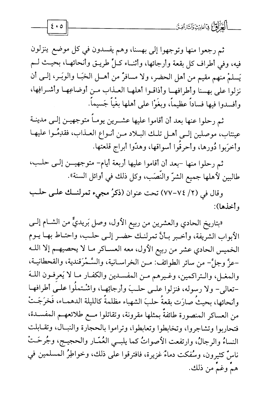ثم رحلوا منها -بعد أن أقاموا عليها أربعة أيام- متوجهين إلى حلب، طالبين لأهلها جميع الشرّ والنّصَب، وكل ذلك في أوائل السنة» .