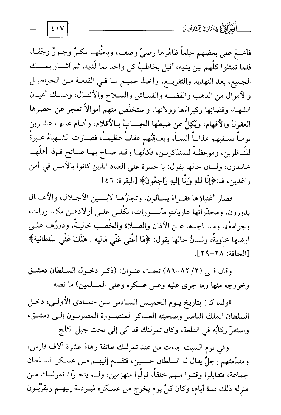وقال في (2/82-86) تحت عنوان: (ذكر دخول السلطان دمشق وخروجه منها وما جرى عليه وعلى عسكره وعلى المسلمين) ما نصه: