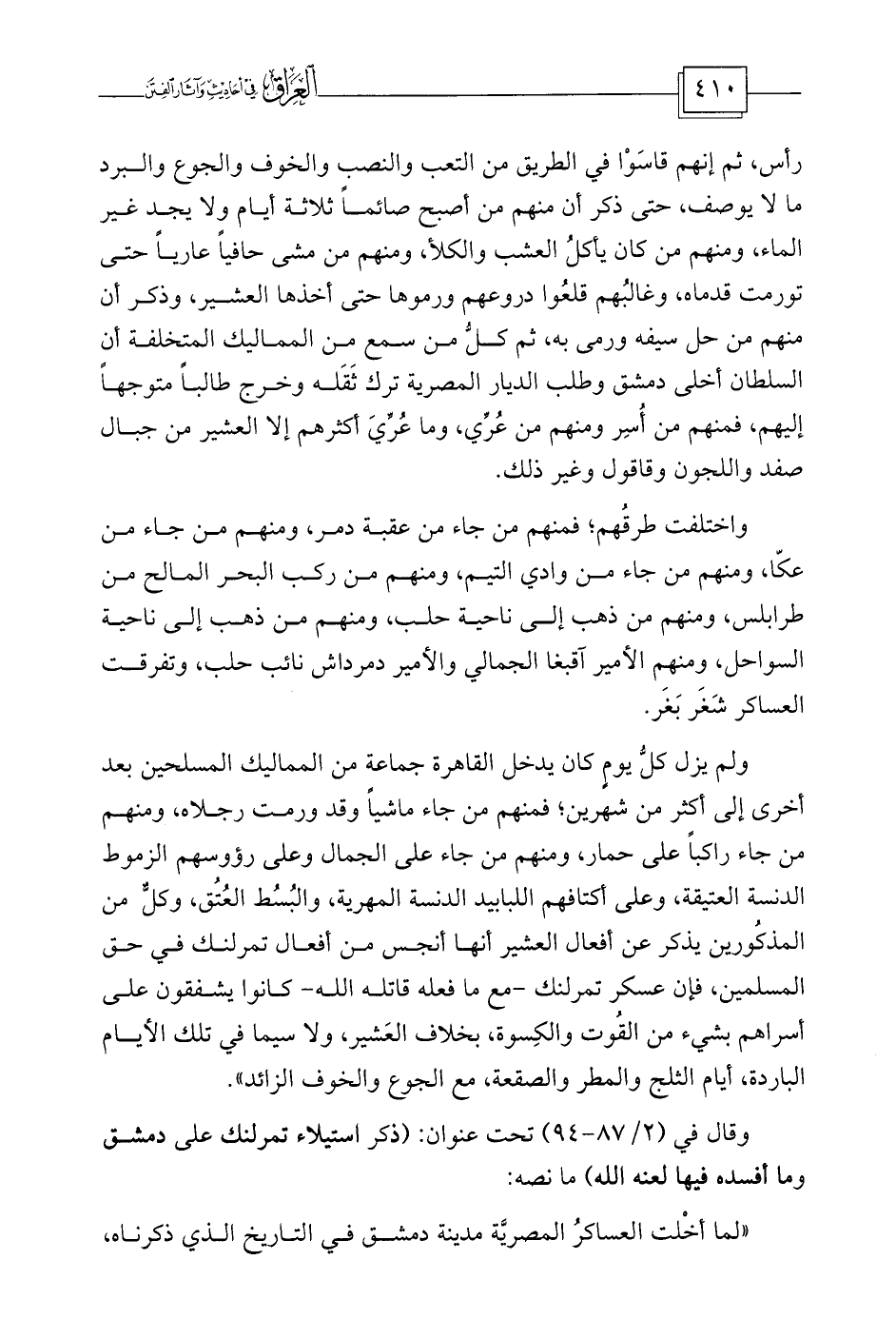 وقال في (2/87-94) تحت عنوان: (ذكر استيلاء تمرلنك على دمشق وما أفسده فيها لعنه الله) ما نصه: