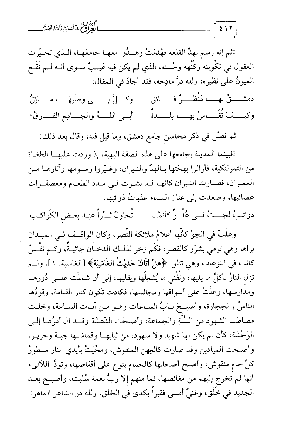 ثم فصَّل في ذكر محاسنِ جامع دمشق، وما قيل فيه، وقال بعد ذلك: