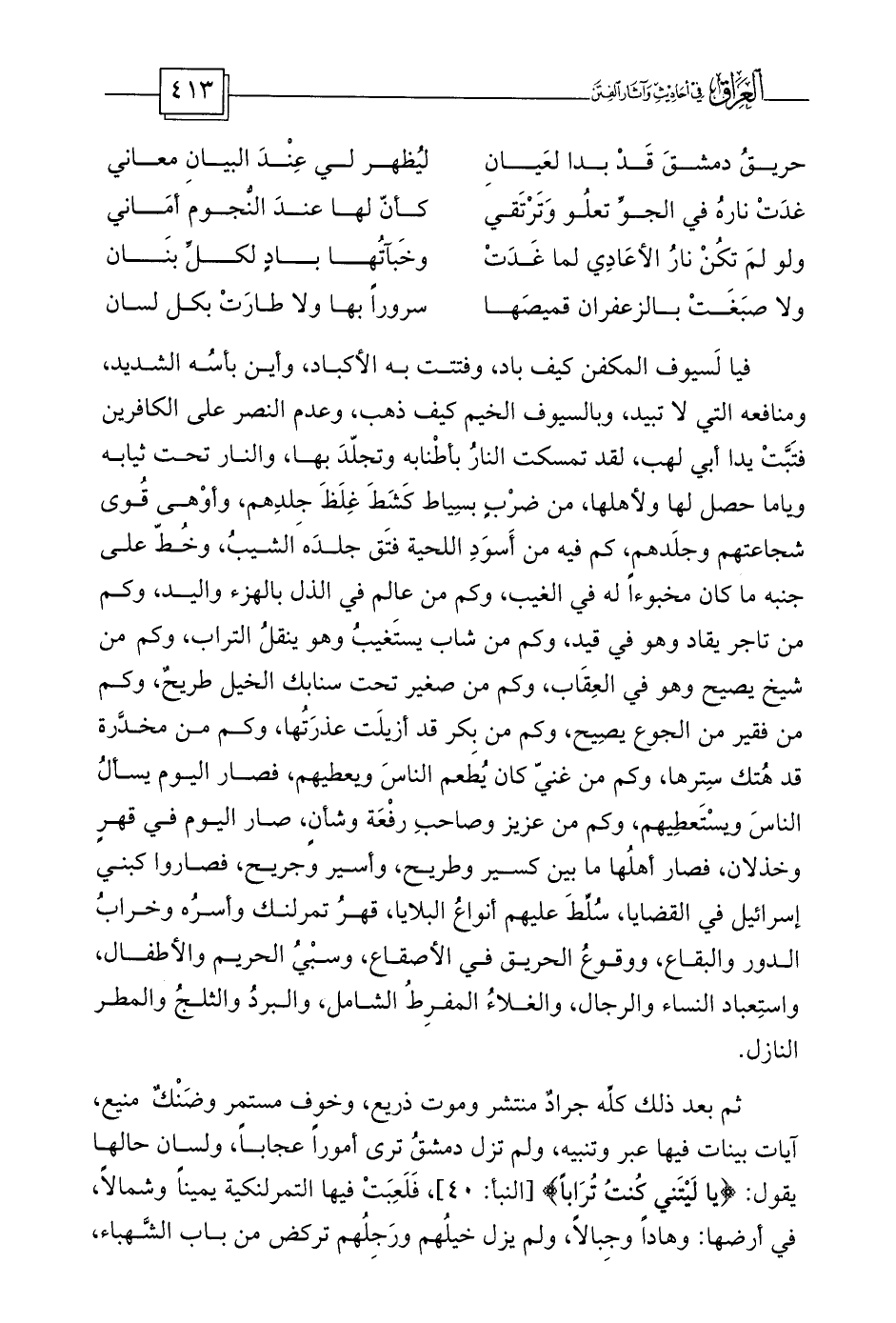 فيا لَسيوف المكفن كيف باد، وفتتت به الأكباد، وأين بأسُه الشديد، ومنافعه التي لا تبيد، وبالسيوف الخيم كيف ذهب، وعدم النصر على الكافرين فتَبَّتْ يدا أبي لهب، لقد تمسكت النارُ بأطْنابه وتجلّدَ بها، والنار تحت ثيابه وياما حصل لها ولأهلها، من ضرْبٍ بسِياط كَشَطَ غِلَظَ جِلدِهم، وأوْهى قُوى شجاعتهم وجلَدهم، كم فيه من أَسوَدِ اللحية فتَق جلدَه الشيبُ، وخُطّ على جنبه ما كان مخبوءاً له في الغيب، وكم من عالم في الذل بالهزء واليد، وكم من تاجر يقاد وهو في قيد، وكم من شاب يستَغيبُ وهو ينقلُ التراب، وكم من شيخ يصيح وهو في العِقَاب، وكم من صغير تحت سنابك الخيل طريحٌ، وكم من فقير من الجوع يصِيح، وكم من بِكر قد أزيلَت عذرَتُها، وكم من مخدَّرة قد هُتك سِترها، وكم من غنيّ كان يُطعم الناسَ ويعطيهم، فصار اليوم يسألُ الناسَ ويسْتَعطِيهم، وكم من عزيز وصاحبِ رفْعَة وشأنٍ، صار اليوم في قهرٍ وخذلان، فصار أهلُها ما بين كسير وطريح، وأسير وجريح، فصاروا كبني إسرائيل في القضايا، سُلِّطَ عليهم أنواعُ البلايا، قهرُ تمرلنك وأسرُه وخرابُ الدور والبقاع، ووقوعُ الحريق في الأصقاع، وسبْيُ الحريم والأطفال، واستِعباد النساء والرجال، والغلاءُ المفرِطُ الشامل، والبردُ والثلجُ والمطر النازل.