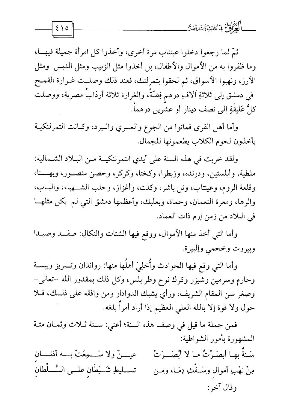 ولقد خربت في هذه السنة على أيدي التمرلنكية من البلاد الشمالية: ملطية، وأبلستين، ودرنده، وزبطرا، وكختا، وكركر، وحصن منصور، وبهسنا، وقلعة الروم، وعينتاب، وتل باشر، وكلت، وأغزاز، وحلب الشهباء، والباب، والرها، ومعرة النعمان، وحماة، وبعلبك، وأعظمها دمشق التي لم يكن مثلها في البلاد من زمن إرم ذات العماد.