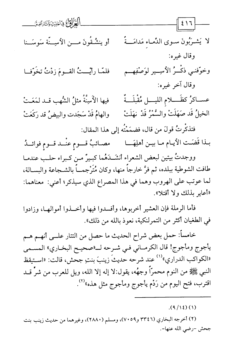 خامساً: حمل بعض شراح الحديث ما حصل من التتار على أنهم هم يأجوج ومأجوج! قال الكرماني في شرحه لـ «صحيح البخاري» المسمى «الكواكب الدراري» (¬1) عند شرحه حديثَ زينبَ بنتِ جحش، قالت: «استيقظ النبي صلى الله عليه وسلم من النوم محمرّاً وجهُه، يقول: لا إله إلا الله، ويل للعرب من شرٍّ قد اقترب، فتح اليوم من رَدْم يأجوج ومأجوج مثل هذه» (¬2) .
