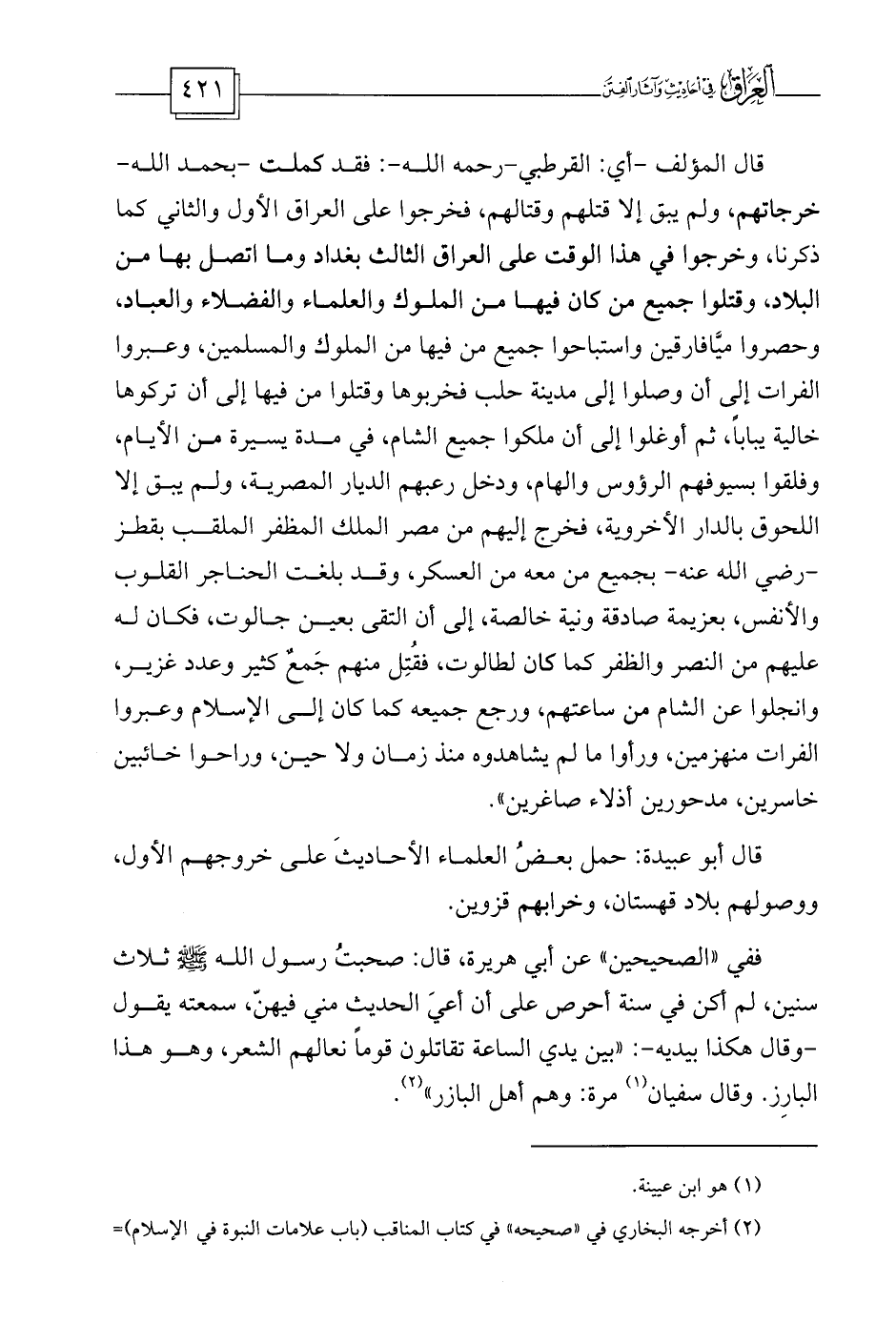 قال أبو عبيدة: حمل بعضُ العلماءِ الأحاديثَ على خروجهم الأول، ووصولهم بلاد قهستان، وخرابهم قزوين.