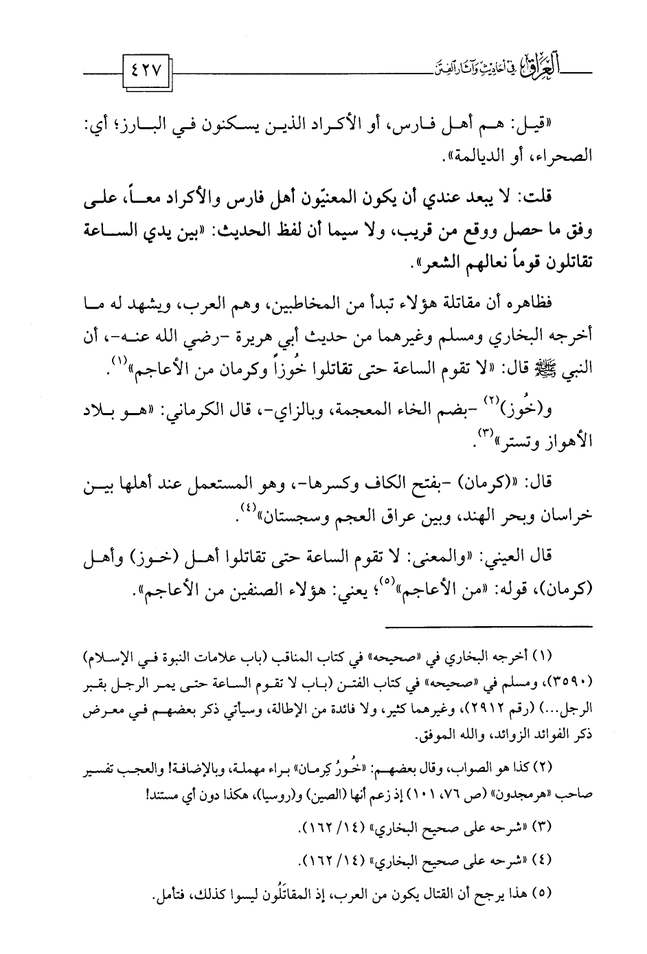 قلت: لا يبعد عندي أن يكون المعنيّون أهل فارس والأكراد معاً، على وفق ما حصل ووقع من قريب، ولا سيما أن لفظ الحديث: «بين يدي الساعة تقاتلون قوماً نعالهم الشعر» .