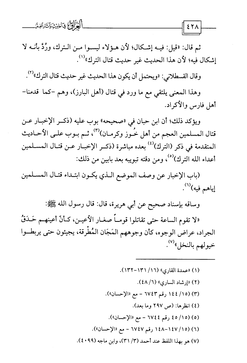 ويؤكد ذلك؛ أن ابن حبان في «صحيحه» بوب عليه (ذكر الإخبار عن قتال المسلمين العجم من أهل خُوز وكرمان) (¬3) ، ثم بوب على الأحاديث المتقدمة في ذكر (الترك) (¬4) بعده مباشرة (ذكر الإخبار عن قتال المسلمين أعداء الله الترك) (¬5) ، ومن دقته تبويبه بعد بابين من ذلك: