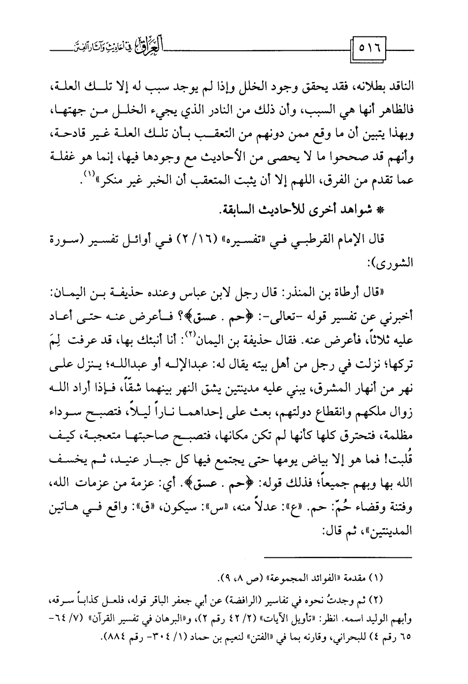 «قال أرطاة بن المنذر: قال رجل لابن عباس وعنده حذيفة بن اليمان: أخبرني عن تفسير قوله -تعالى-: {حم. عسق} ؟ فأعرض عنه حتى أعاد عليه ثلاثاً، فأعرض عنه. فقال حذيفة بن اليمان: أنا أنبئك بها، قد عرفت لِمَ تركها؛ نزلت في رجل من أهل بيته يقال له: عبد الإله أو عبد الله؛ ينزل على نهر من أنهار المشرق، يبني عليه مدينتين يشق النهر بينهما شقّاً، فإذا أراد الله زوال ملكهم وانقطاع دولتهم، بعث على إحداهما ناراً ليلاً، فتصبح سوداء مظلمة، فتحترق كلها كأنها لم تكن مكانها، فتصبح صاحبتها متعجبة، كيف قُلبت! فما هو إلا بياض يومها حتى يجتمع فيها كل جبار عنيد، ثم يخسف الله بها وبهم جميعاً؛ فذلك قوله: {حم. عسق} . أي: عزمة من عزمات الله، وفتنة وقضاء حُمّ: حم. «ع» : عدلاً منه، «س» : سيكون، «ق» : واقع في هاتين المدينتين» ، ثم قال: