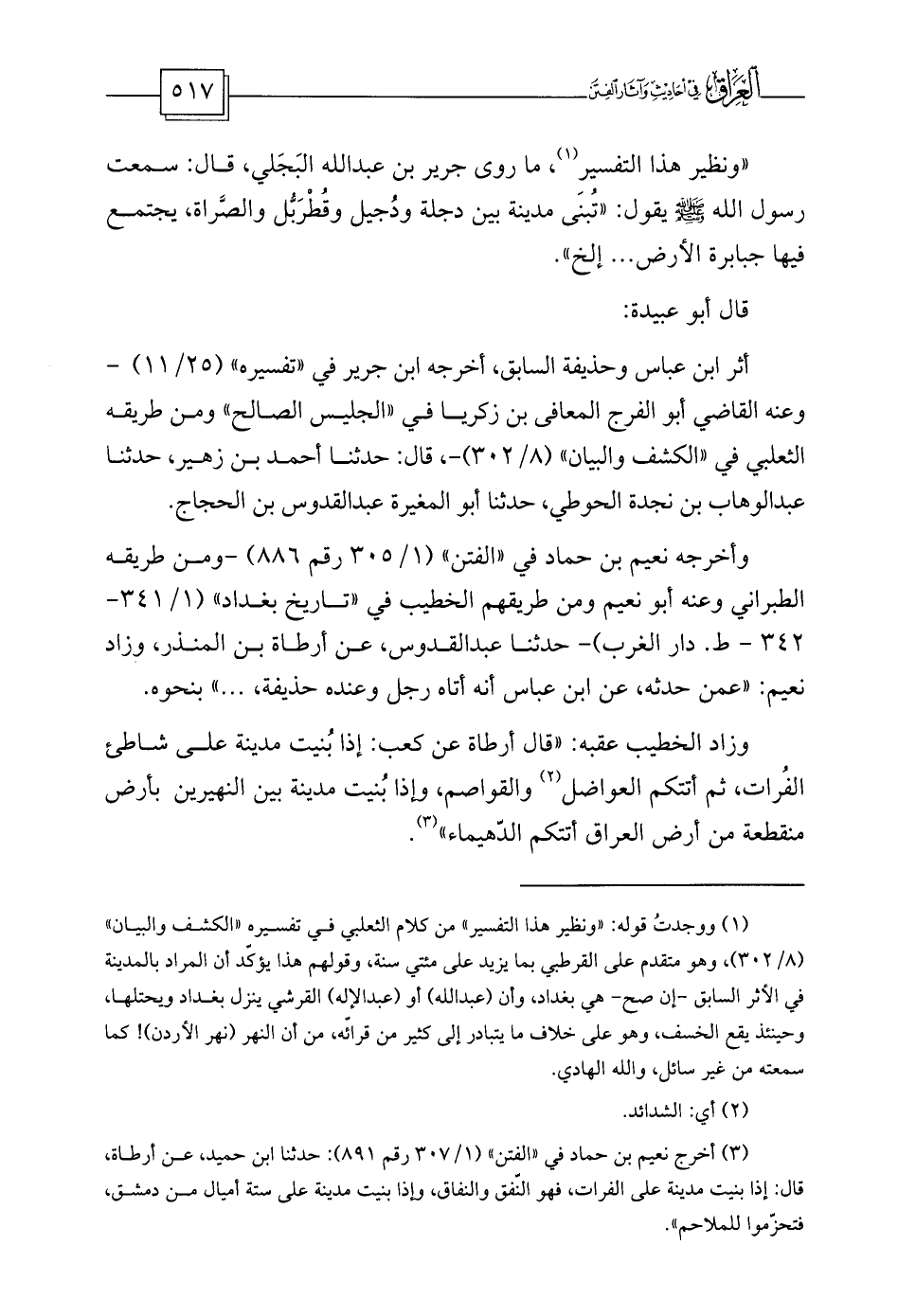 (¬1) ووجدتُ قوله: «ونظير هذا التفسير» من كلام الثعلبي في تفسيره «الكشف والبيان» (8/302) ، وهو متقدم على القرطبي بما يزيد على مئتي سنة، وقولهم هذا يؤكّد أن المراد بالمدينة في الأثر السابق -إن صح- هي بغداد، وأن (عبد الله) أو (عبد الإله) القرشي ينزل بغداد ويحتلها، وحينئذ يقع الخسف، وهو على خلاف ما يتبادر إلى كثير من قرائّه، من أن النهر (نهر الأردن) ! كما سمعته من غير سائل، والله الهادي.
