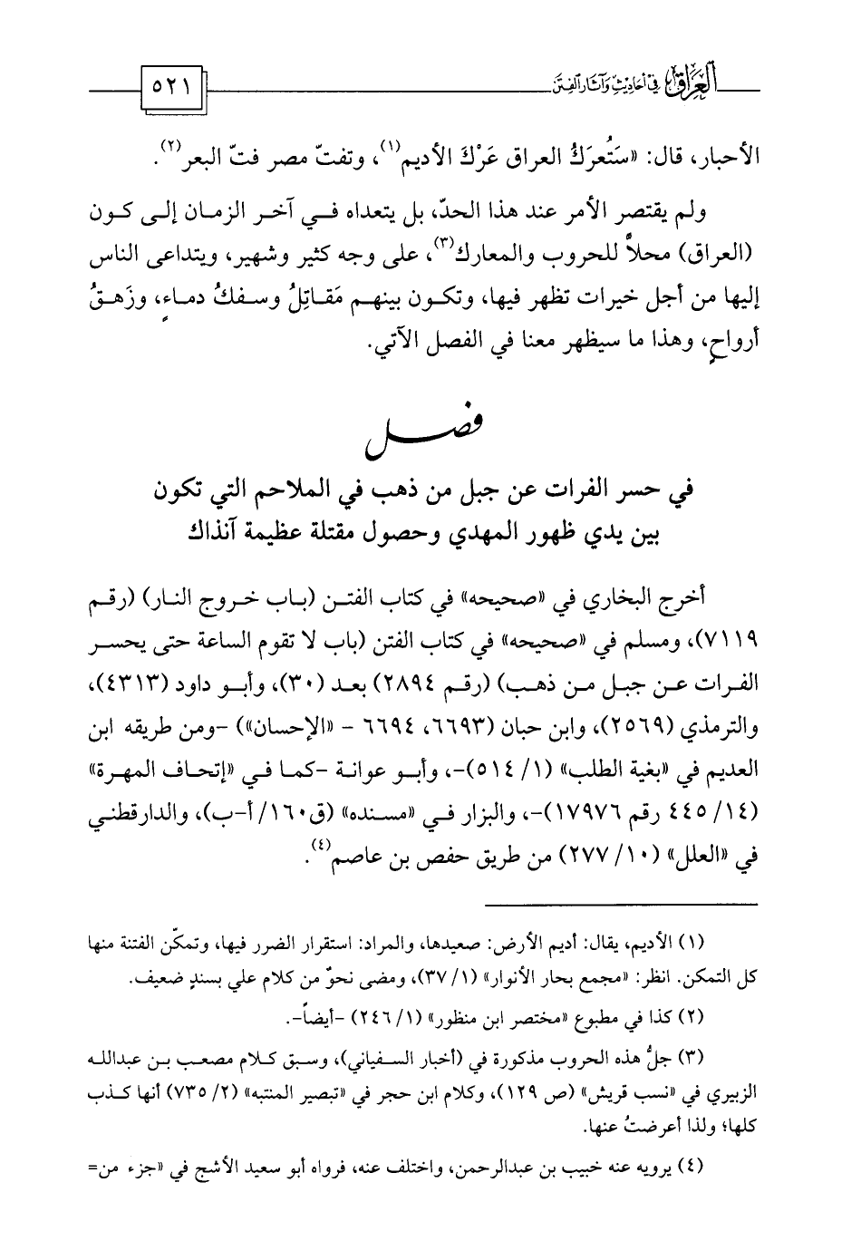 ولم يقتصر الأمر عند هذا الحدّ، بل يتعداه في آخر الزمان إلى كون (العراق) محلاًّ للحروب والمعارك (¬3) ، على وجه كثير وشهير، ويتداعى الناس إليها من أجل خيرات تظهر فيها، وتكون بينهم مَقاتِلُ وسفكُ دماءٍ، وزَهقُ أرواحٍ، وهذا ما سيظهر معنا في الفصل الآتي.