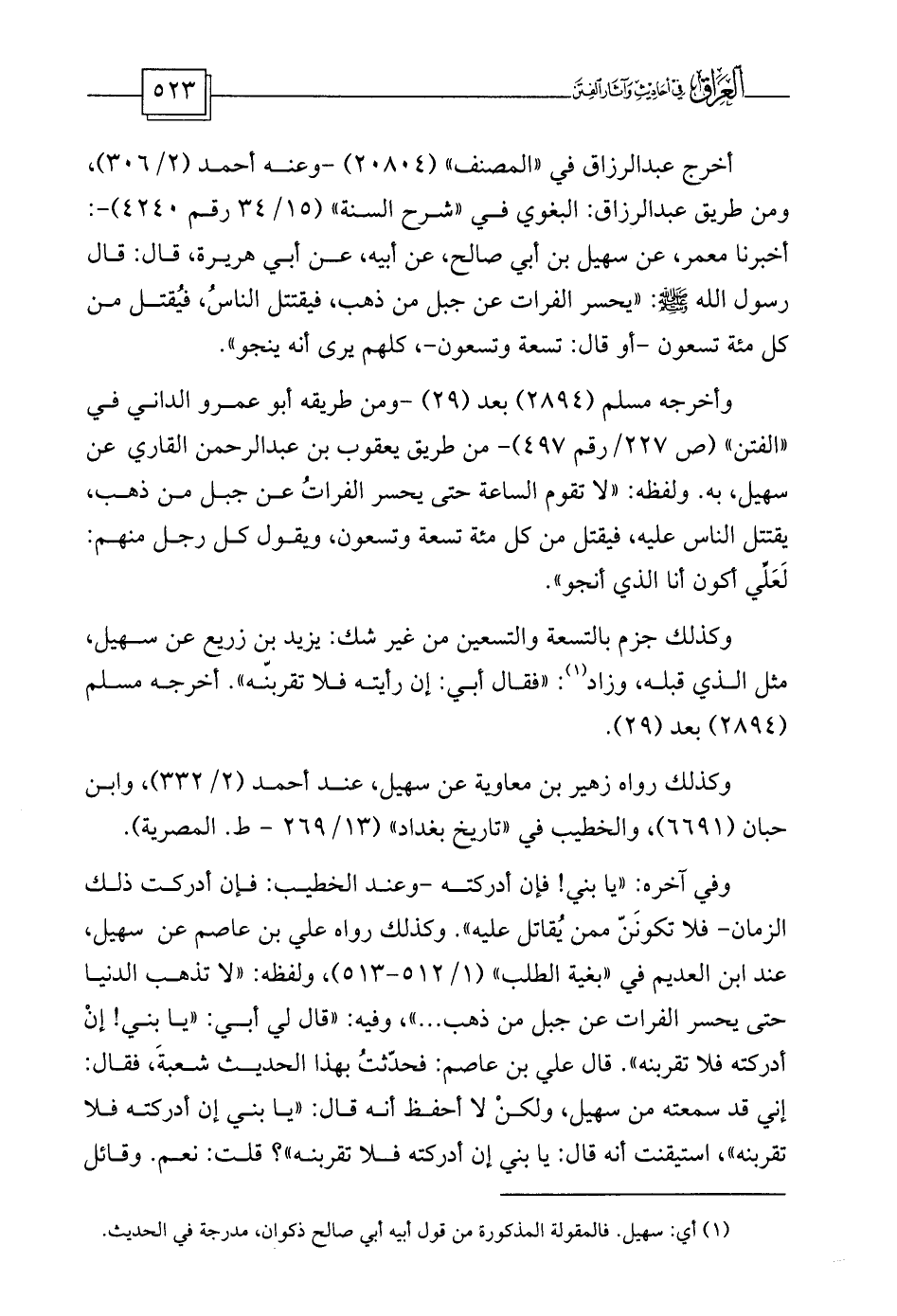 وفي آخره: «يا بني! فإن أدركته -وعند الخطيب: فإن أدركت ذلك الزمان- فلا تكونَنّ ممن يُقاتل عليه» . وكذلك رواه علي بن عاصم عن سهيل، عند ابن العديم في «بغية الطلب» (1/512-513) ، ولفظه: «لا تذهب الدنيا حتى يحسر الفرات عن جبل من ذهب ... » ، وفيه: «قال لي أبي: «يا بني! إنْ أدركته فلا تقربنه» . قال علي بن عاصم: فحدّثتُ بهذا الحديث شعبةَ، فقال: إني قد سمعته من سهيل، ولكنْ لا أحفظ أنه قال: «يا بني إن أدركته فلا تقربنه» ، استيقنت أنه قال: يا بني إن أدركته فلا تقربنه» ؟ قلت: نعم. وقائل