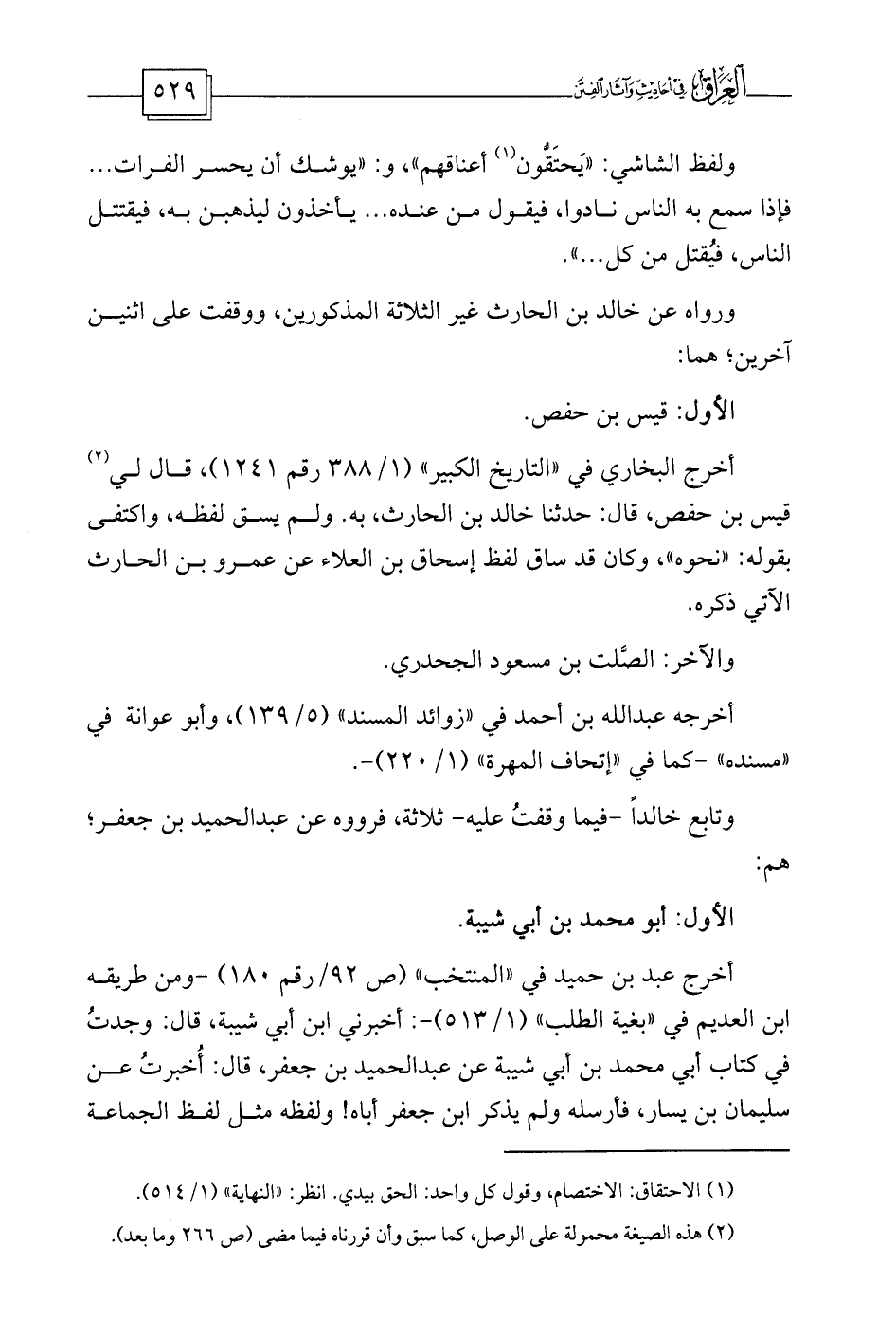أخرج البخاري في «التاريخ الكبير» (1/388 رقم 1241) ، قال لي (¬2) قيس بن حفص، قال: حدثنا خالد بن الحارث، به. ولم يسق لفظه، واكتفى بقوله: «نحوه» ، وكان قد ساق لفظ إسحاق بن العلاء عن عمرو بن الحارث الآتي ذكره.