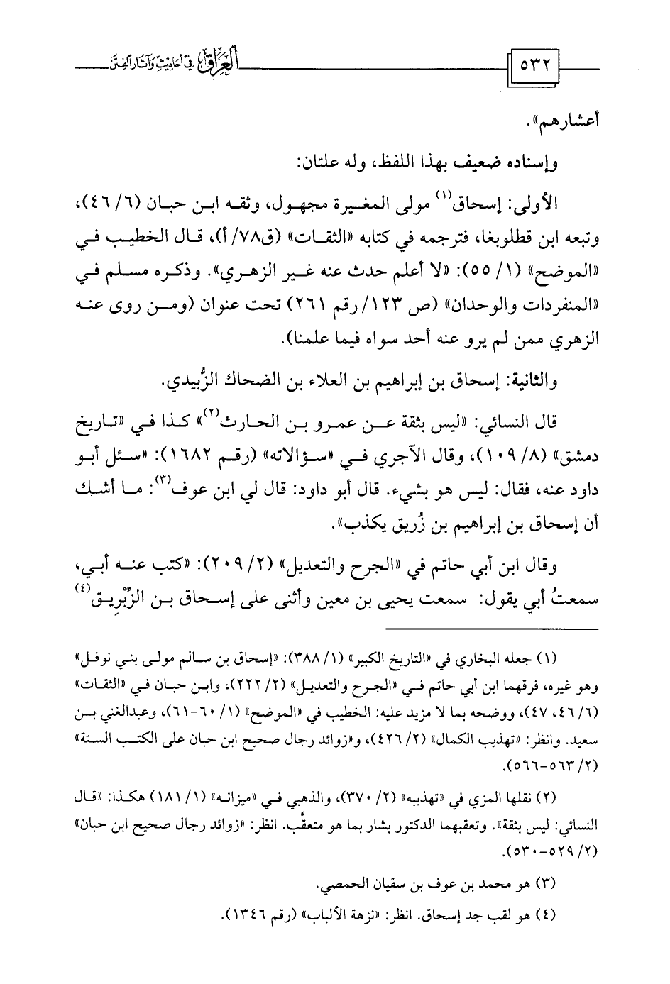 الأولى: إسحاق (¬1) مولى المغيرة مجهول، وثقه ابن حبان (6/46) ، وتبعه ابن قطلوبغا، فترجمه في كتابه «الثقات» (ق78/أ) ، قال الخطيب في «الموضح» (1/55) : «لا أعلم حدث عنه غير الزهري» . وذكره مسلم في «المنفردات والوحدان» (ص 123/رقم 261) تحت عنوان (ومن روى عنه الزهري ممن لم يرو عنه أحد سواه فيما علمنا) .