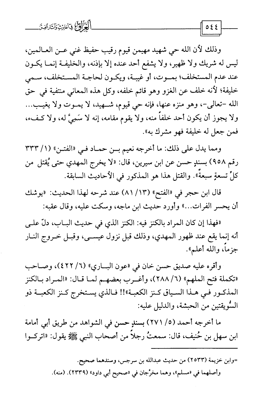 وأقره عليه صديق حسن خان في «عون الباري» (6/422) ، وصاحب «تكملة فتح الملهم» (6/288) ، وأغرب بعضهم لما قال: «المراد بالكنز المذكور في هذا السياق كنز الكعبة» !! فالذي يستخرج كنز الكعبة ذو السُّويقتين من الحبشة، والدليل عليه:
