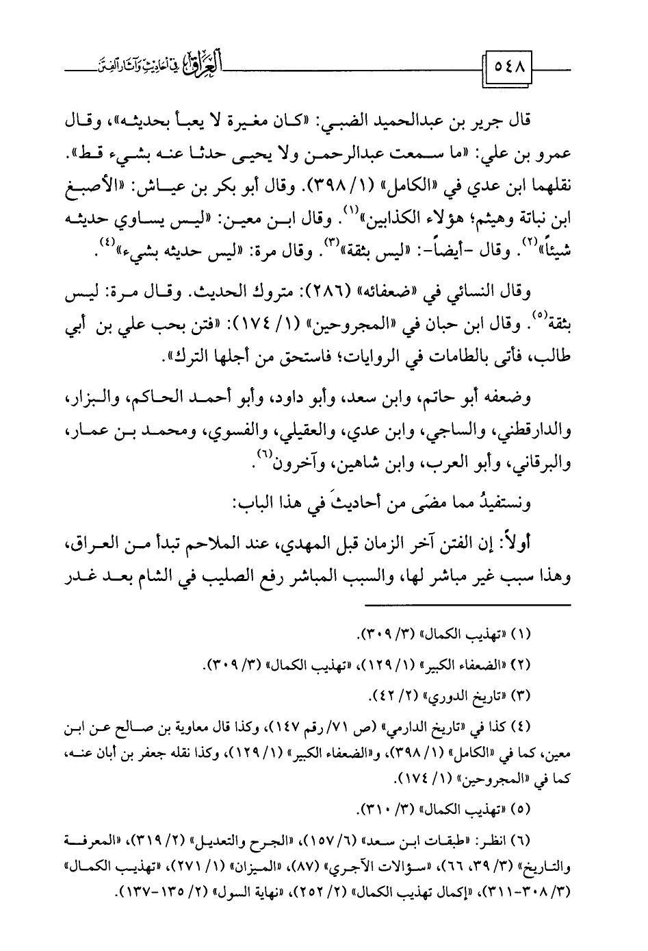 (¬6) انظر: «طبقات ابن سعد» (6/157) ، «الجرح والتعديل» (2/319) ، «المعرفة والتاريخ» (3/39، 66) ، «سؤالات الآجري» (87) ، «الميزان» (1/271) ، «تهذيب الكمال» (3/308-311) ، «إكمال تهذيب الكمال» (2/252) ، «نهاية السول» (2/135-137) .