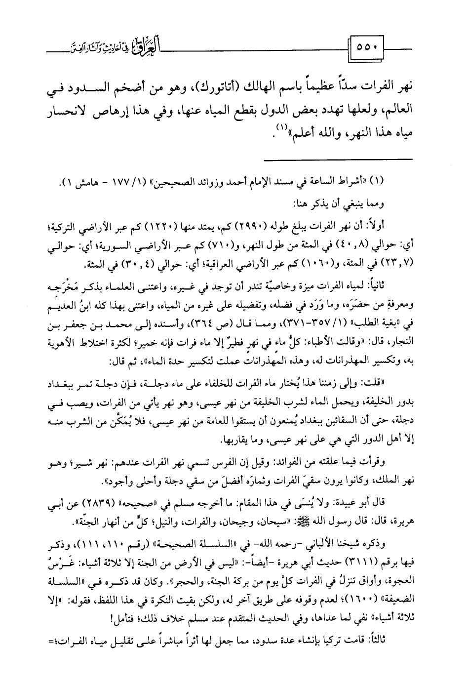 نهر الفرات سدّاً عظيماً باسم الهالك (أتاتورك) ، وهو من أضخم السدود في العالم، ولعلها تهدد بعض الدول بقطع المياه عنها، وفي هذا إرهاص لانحسار مياه هذا النهر، والله أعلم» (¬1) .