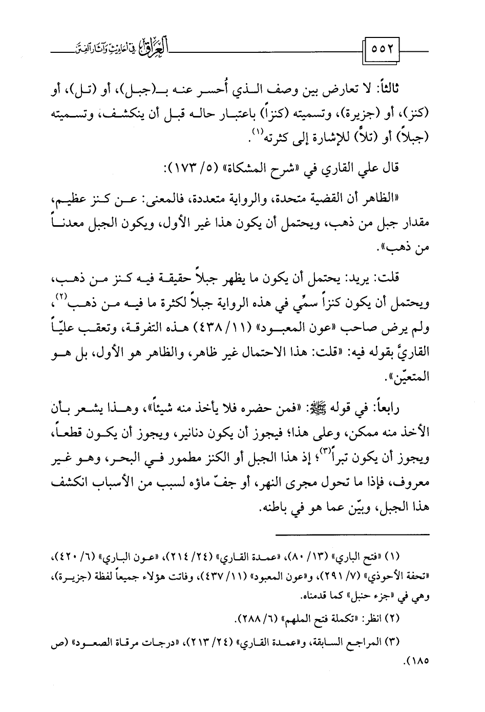 قلت: يريد: يحتمل أن يكون ما يظهر جبلاً حقيقة فيه كنز من ذهب، ويحتمل أن يكون كنزاً سمِّي في هذه الرواية جبلاً لكثرة ما فيه من ذهب (¬2) ، ولم يرض صاحب «عون المعبود» (11/438) هذه التفرقة، وتعقب عليّاً القاريَّ بقوله فيه: «قلت: هذا الاحتمال غير ظاهر، والظاهر هو الأول، بل هو المتعيّن» .