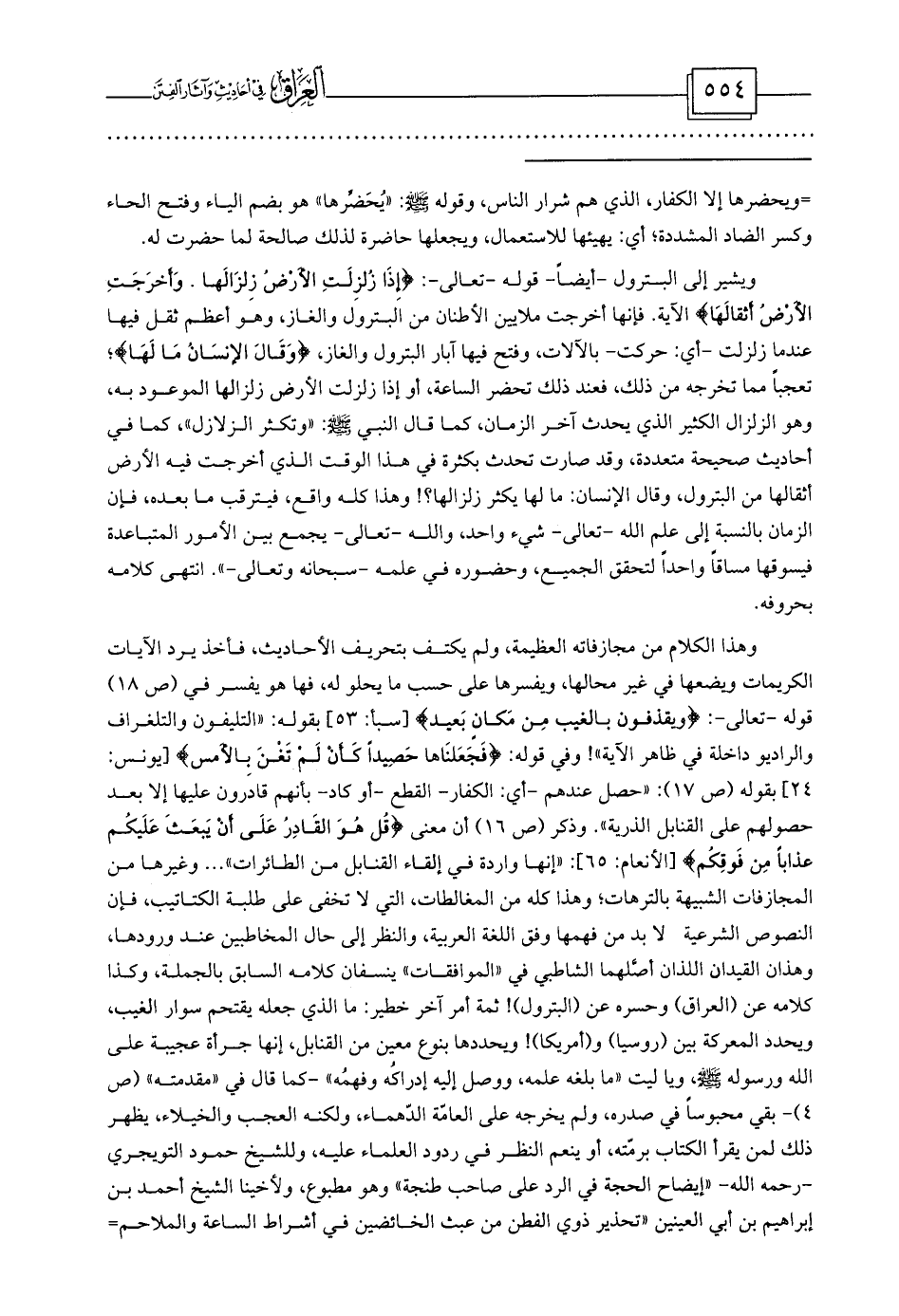 وهذا الكلام من مجازفاته العظيمة، ولم يكتف بتحريف الأحاديث، فأخذ يرد الآيات الكريمات ويضعها في غير محالها، ويفسرها على حسب ما يحلو له، فها هو يفسر في (ص 18) قوله -تعالى-: {ويقذفون بالغيب مِن مَكانٍ بَعيد} [سبأ: 53] بقوله: «التليفون والتلغراف والراديو داخلة في ظاهر الآية» ! وفي قوله: {فَجَعَلنَاها حَصِيداً كَأَنْ لَمْ تَغْنَ بِالأَمس} [يونس: 24] بقوله (ص 17) : «حصل عندهم -أي: الكفار- القطع -أو كاد- بأنهم قادرون عليها إلا بعد حصولهم على القنابل الذرية» . وذكر (ص 16) أن معنى {قُل هُوَ القَادِرُ عَلَى أَنْ يَبعَثَ عَلَيكُم عذاباً مِن فَوقِكُم} [الأنعام: 65] : «إنها واردة في إلقاء القنابل من الطائرات» ... وغيرها من المجازفات الشبيهة بالترهات؛ وهذا كله من المغالطات، التي لا تخفى على طلبة الكتاتيب، فإن النصوص الشرعية لا بد من فهمها وفق اللغة العربية، والنظر إلى حال المخاطبين عند ورودها، وهذان القيدان اللذان أصَّلهما الشاطبي في «الموافقات» ينسفان كلامه السابق بالجملة، وكذا كلامه عن (العراق) وحسره عن (البترول) ! ثمة أمر آخر خطير: ما الذي جعله يقتحم سوار الغيب، ويحدد المعركة بين (روسيا) و (أمريكا) ! ويحددها بنوع معين من القنابل، إنها جرأة عجيبة على الله ورسوله - صلى الله عليه وسلم -، ويا ليت «ما بلغه علمه، ووصل إليه إدراكُه وفهمُه» -كما قال في «مقدمته» (ص 4) - بقي محبوساً في صدره، ولم يخرجه على العامّة الدّهماء، ولكنه العجب والخيلاء، يظهر ذلك لمن يقرأ الكتاب برمّته، أو ينعم النظر في ردود العلماء عليه، وللشيخ حمود التويجري ... -رحمه الله- «إيضاح الحجة في الرد على صاحب طنجة» وهو مطبوع، ولأخينا الشيخ أحمد بن إبراهيم بن أبي العينين «تحذير ذوي الفطن من عبث الخائضين في أشراط الساعة والملاحم =