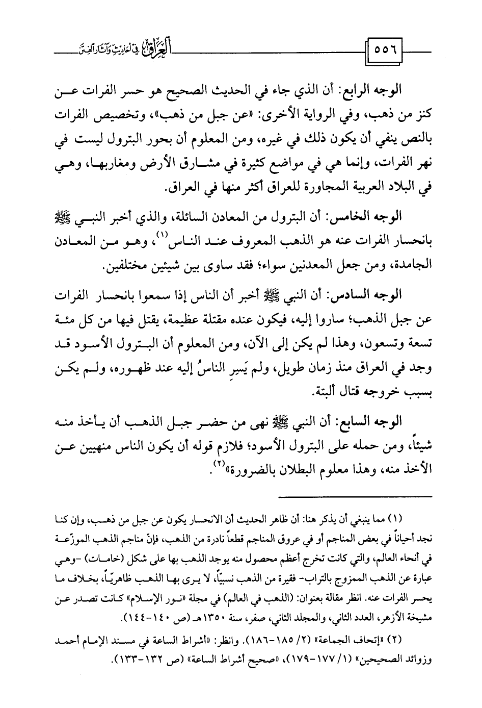 الوجه الرابع: أن الذي جاء في الحديث الصحيح هو حسر الفرات عن كنز من ذهب، وفي الرواية الأخرى: «عن جبل من ذهب» ، وتخصيص الفرات بالنص ينفي أن يكون ذلك في غيره، ومن المعلوم أن بحور البترول ليست في نهر الفرات، وإنما هي في مواضع كثيرة في مشارق الأرض ومغاربها، وهي في البلاد العربية المجاورة للعراق أكثر منها في العراق.
