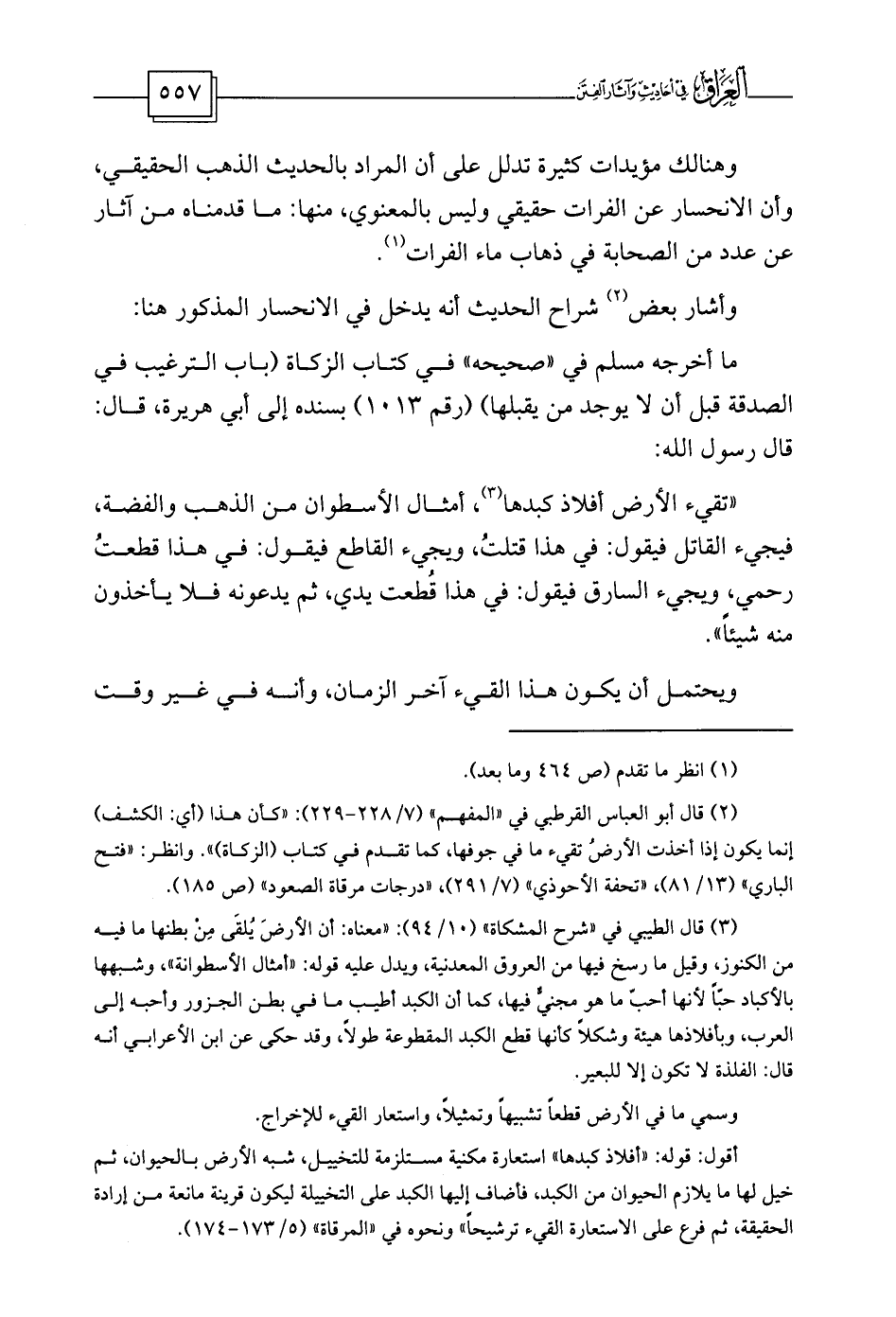 (¬3) قال الطيبي في «شرح المشكاة» (10/94) : «معناه: أن الأرضَ يُلقَى مِنْ بطنها ما فيه من الكنوز، وقيل ما رسخ فيها من العروق المعدنية، ويدل عليه قوله: «أمثال الأسطوانة» ، وشبهها بالأكباد حبّاً لأنها أحبّ ما هو مجنيٌّ فيها، كما أن الكبد أطيب ما في بطن الجزور وأحبه إلى العرب، وبأفلاذها هيئة وشكلاً كأنها قطع الكبد المقطوعة طولاً، وقد حكى عن ابن الأعرابي أنه قال: الفلذة لا تكون إلا للبعير.
