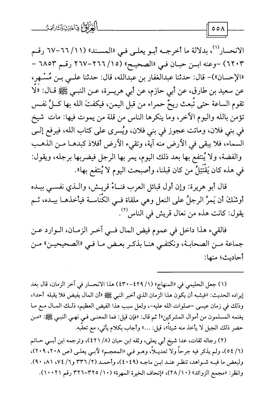 الانحسار (¬1) ، بدلالة ما أخرجه أبو يعلى في «المسند» (11/66-67 رقم 6203) -وعنه ابن حبان في «الصحيح» (15/266-267 رقم 6853 - «الإحسان» ) - قال: حدثنا عبد الغفار بن عبد الله، قال: حدثنا علي بن مُسْهِرٍ، عن سعيد بن طارق، عن أبي حازم، عن أبي هريرة، عن النبي صلى الله عليه وسلم قال: «لا تقوم الساعة حتى تُبعث ريحٌ حمراء من قبل اليمن، فيكفتَ الله بها كلَّ نفس تؤمن بالله واليوم الآخر، وما ينكرها الناس من قلة من يموت فيها: مات شيخ في بني فلان، وماتت عجوز في بني فلان، ويُسرى على كتاب الله، فيرفع إلى السماء، فلا يبقى في الأرض منه آية، وتقيء الأرض أفلاذ كبدها من الذهب والفضة، ولا يُنتفع بها بعد ذلك اليوم، يمر بها الرجل فيضربها برجله، ويقول: في هذه كان يَقْتَتِلُ من كان قبلنا، وأصبحت اليوم لا يُنتفع بها» .
