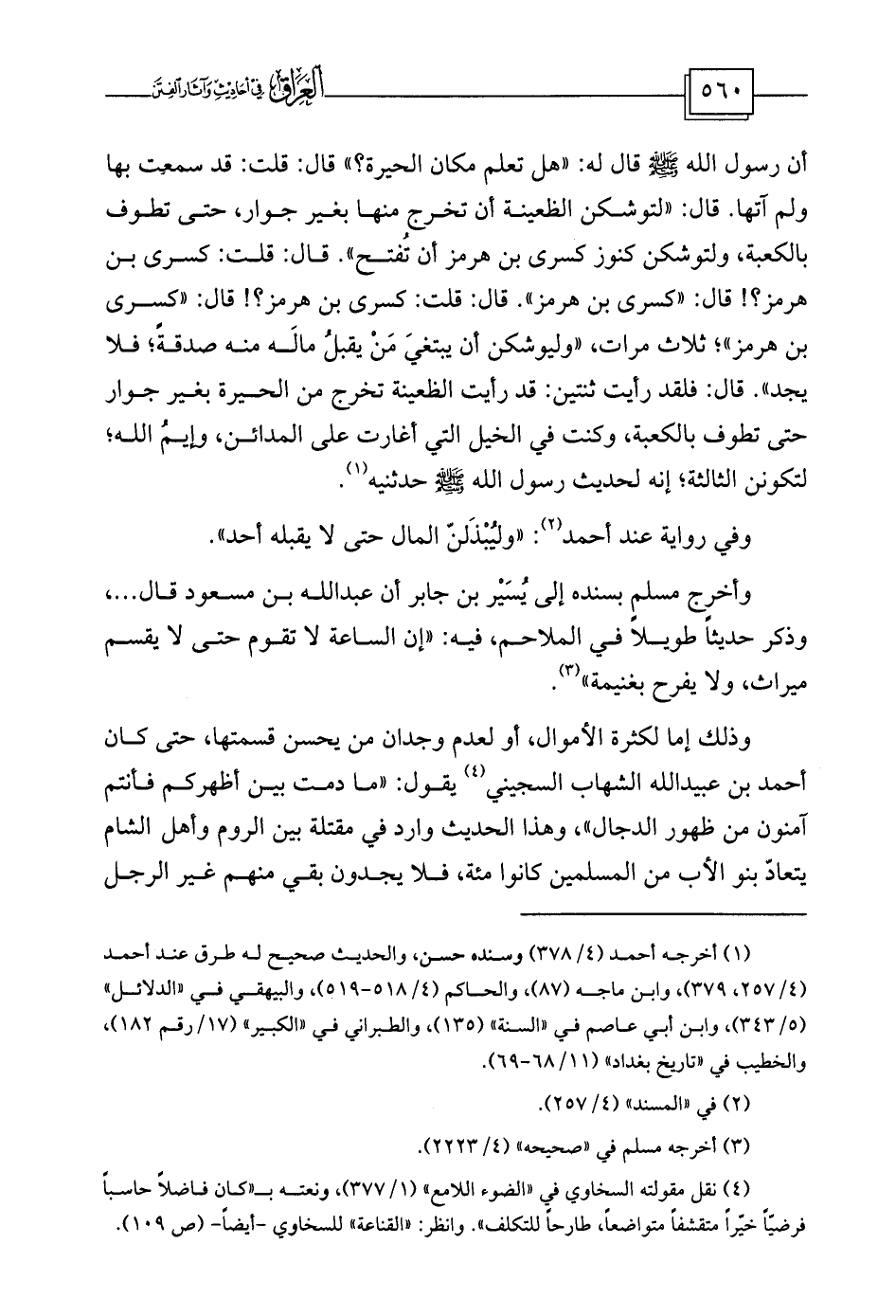 وذلك إما لكثرة الأموال، أو لعدم وجدان من يحسن قسمتها، حتى كان أحمد بن عبيد الله الشهاب السجيني (¬4) يقول: «ما دمت بين أظهركم فأنتم آمنون من ظهور الدجال» ، وهذا الحديث وارد في مقتلة بين الروم وأهل الشام يتعادّ بنو الأب من المسلمين كانوا مئة، فلا يجدون بقي منهم غير الرجل