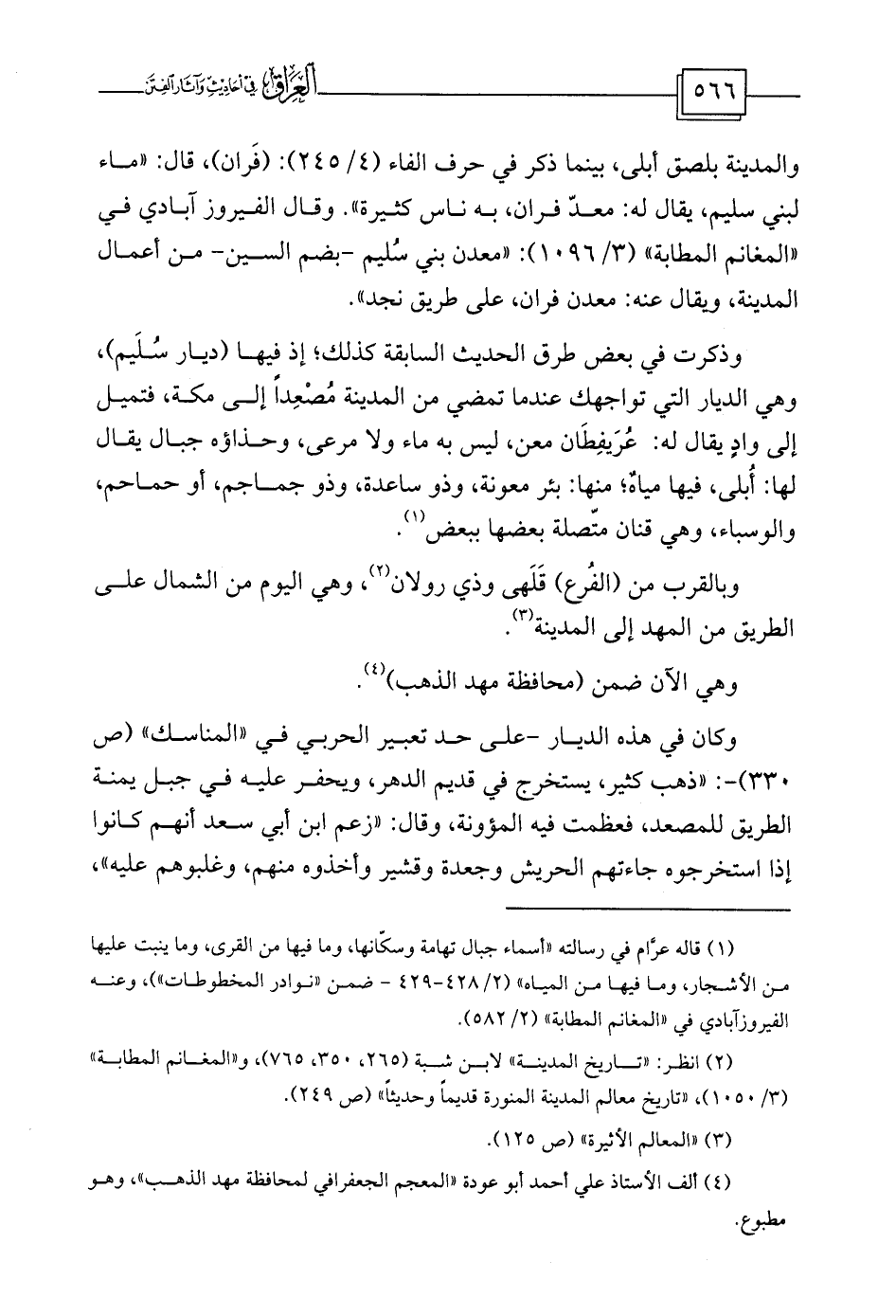 والمدينة بلصق أبلى، بينما ذكر في حرف الفاء (4/245) : (فَران) ، قال: «ماء لبني سليم، يقال له: معدّ فران، به ناس كثيرة» . وقال الفيروز آبادي في «المغانم المطابة» (3/1096) : «معدن بني سُليم -بضم السين- من أعمال المدينة، ويقال عنه: معدن فران، على طريق نجد» .