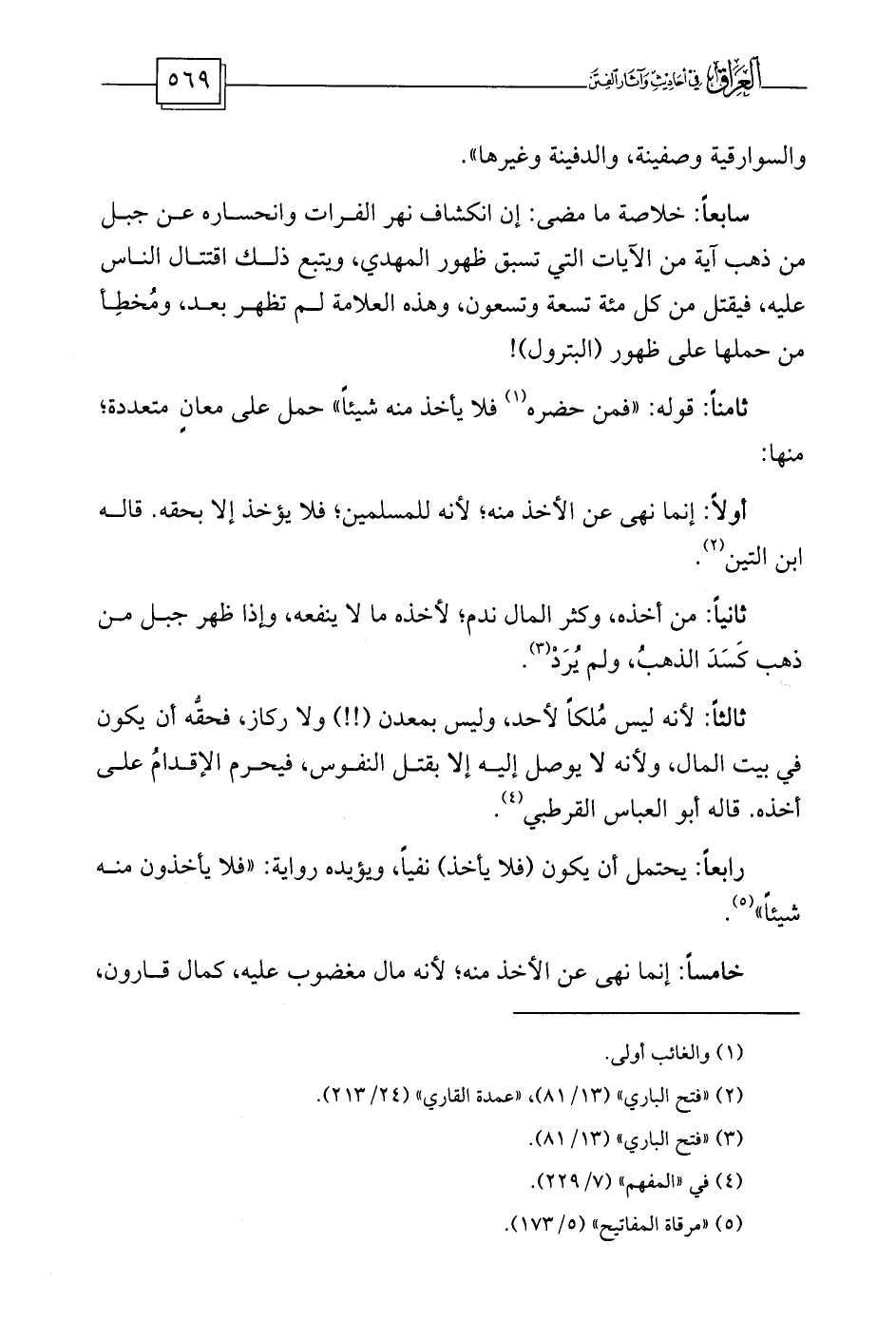 سابعاً: خلاصة ما مضى: إن انكشاف نهر الفرات وانحساره عن جبل من ذهب آية من الآيات التي تسبق ظهور المهدي، ويتبع ذلك اقتتال الناس عليه، فيقتل من كل مئة تسعة وتسعون، وهذه العلامة لم تظهر بعد، ومُخطِأ من حملها على ظهور (البترول) !