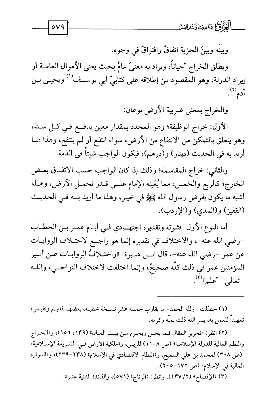 (¬2) انظر: «تحرير المقال فيما يحل ويحرم من بيت المال» (139، 156) ، و «الخراج والنظم المالية للدولة الإسلامية» (ص 8-11) للريس، و «ملكية الأرض في الشريعة الإسلامية» (ص 308) لمحمد بن علي السميح، و «النظام الاقتصادي في الإسلام» (238-239) ، و «الموارد المالية في الإسلام» (ص 172-205) .