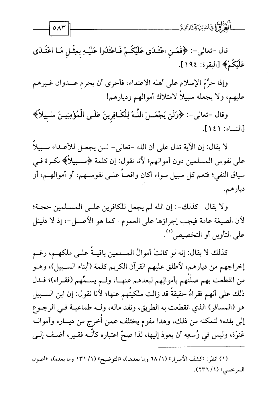 لا يقال: إن الآية تدل على أن الله -تعالى- لن يجعل للأعداء سبيلاً على نفوس المسلمين دون أموالهم؛ لأنا نقول: إن كلمة {سبيلاً} نكرة في سياق النفي؛ فتعم كل سبيل سواء أكان واقعاً على نفوسهم، أو أموالهم، أو ديارهم.