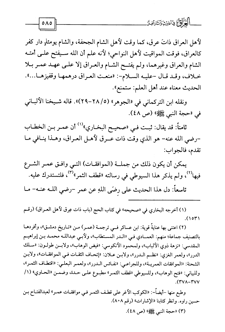 ثامناً: قد يقال: ثبت في «صحيح البخاري» (¬1) أن عمر بن الخطاب ... -رضي الله عنه- هو الذي وقت ذات عرق لأهل العراق، وهذا ينافي ما تقدم، فالجواب: