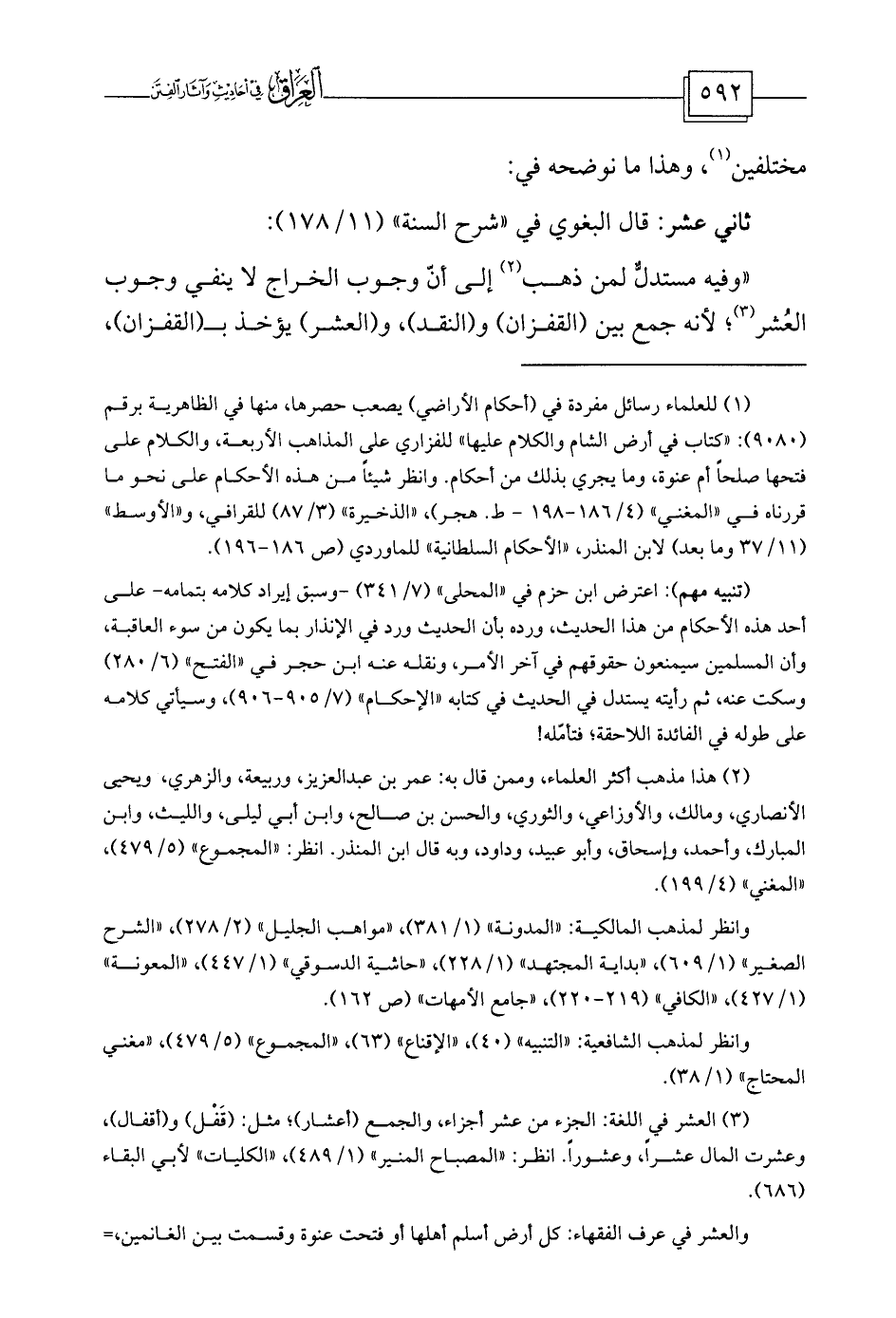 (¬1) للعلماء رسائل مفردة في (أحكام الأراضي) يصعب حصرها، منها في الظاهرية برقم (9080) : «كتاب في أرض الشام والكلام عليها» للفزاري على المذاهب الأربعة، والكلام على فتحها صلحاً أم عنوة، وما يجري بذلك من أحكام. وانظر شيئاً من هذه الأحكام على نحو ما قررناه في «المغني» (4/186-198 - ط. هجر) ، «الذخيرة» (3/87) للقرافي، و «الأوسط» (11/37 وما بعد) لابن المنذر، «الأحكام السلطانية» للماوردي (ص 186-196) .