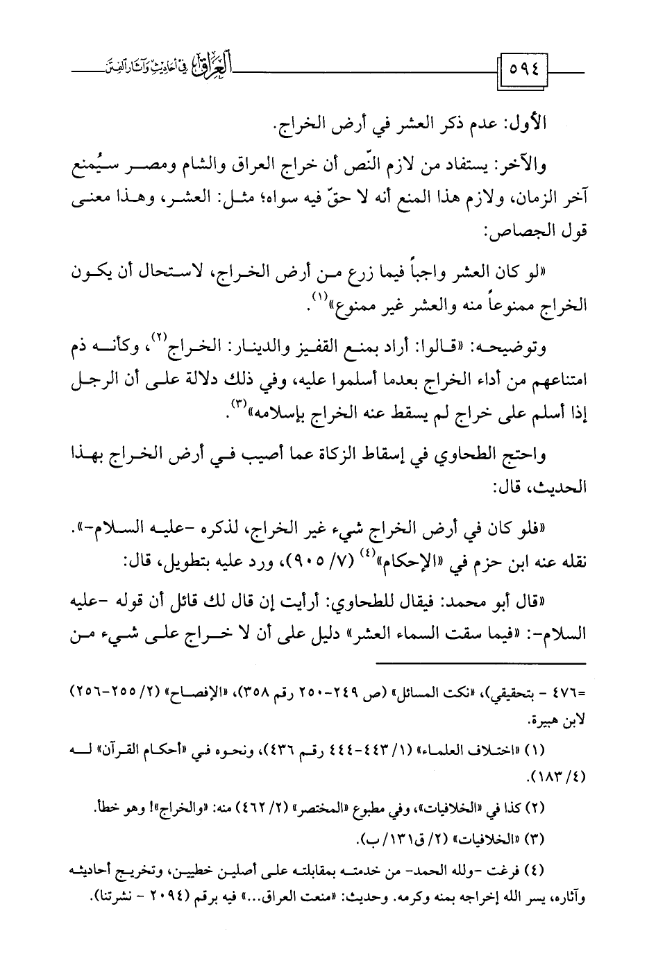 «فلو كان في أرض الخراج شيء غير الخراج، لذكره -عليه السلام-» . نقله عنه ابن حزم في «الإحكام» (¬4) (7/905) ، ورد عليه بتطويل، قال: