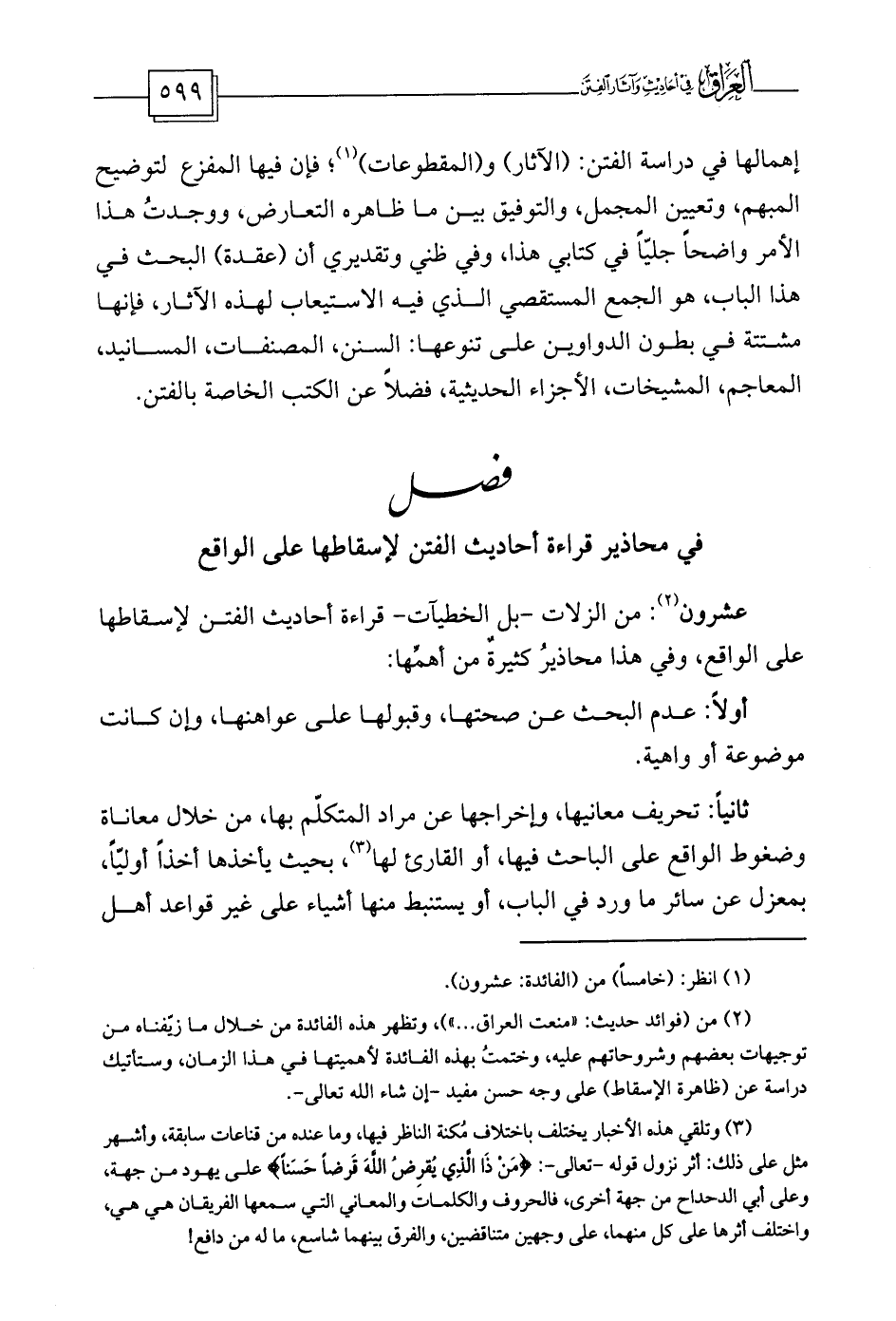 عشرون (¬2) : من الزلات -بل الخطيآت- قراءة أحاديث الفتن لإسقاطها على الواقع، وفي هذا محاذيرُ كثيرةٌ من أهمِّها: